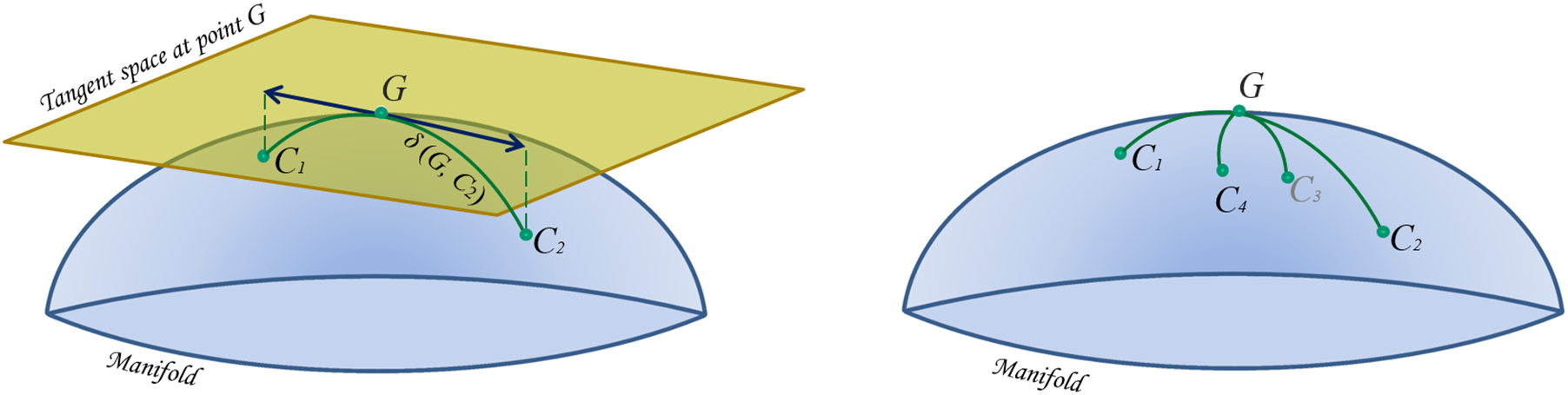 is named the geodesic and its length is the Riemannian distance between them. Curves on the manifolds through a point are mapped on the tangent space as straight lines (local approximation). Right: