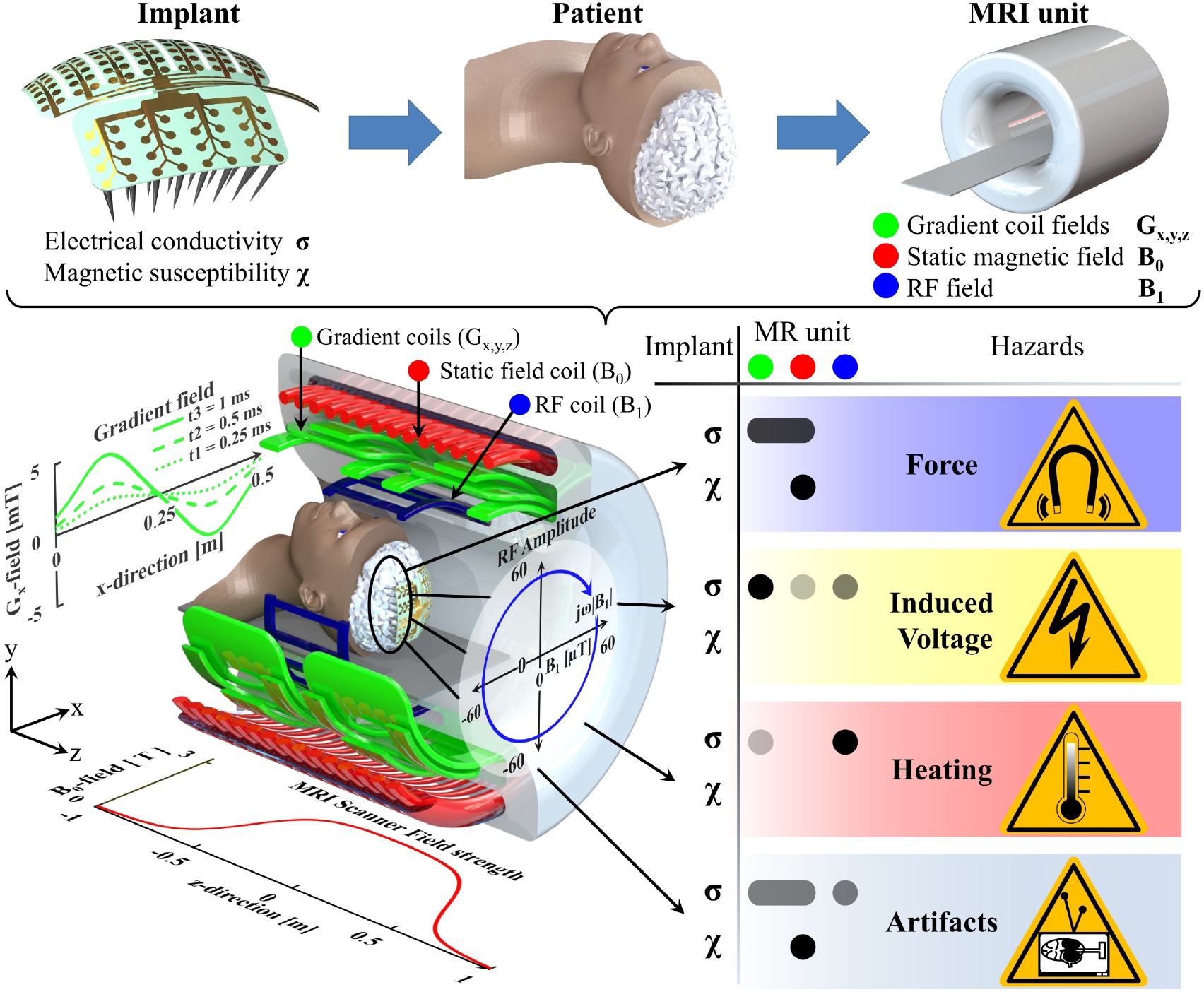 Figure 1. The complex MR environment can interact with an implant in many different ways which may cause hazardous conditions. Forces may occur from gradient coil fields and static fields interacting with the implant. Voltages may be induced by the time variant gradient and RF fields or by rapid transportation of the patient towards the scanner. Heating effects originate from the electric fields of the time variant magnetic fields, where the main contribution is by the powerful radio frequency pulses. Artefacts are mainly attributed to the B0-field by virtue of its deviation caused by susceptibility mismatch, and on the RF field depending on the used sequence. The correlation between the hazard and the MR component is displayed by grey-scaled dots in a table format, where the intensity gives an indication of how severe this interaction can become.
