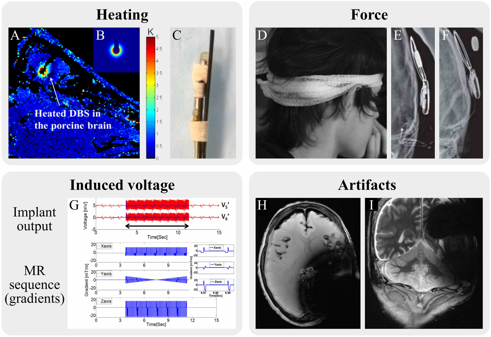 Figure 4. Hazardous MRI-implant interactions and their consequences for the patient. (A)–(C) Modalities for the evaluation of heating: (A) MR thermometry in a porcine brain, (B) the according simulation, (C) an optical temperature sensor mounted to a DBS probe for heating evaluation in phantoms. (A) and (B) show a temperature rise of 5 °C around the DBS probe, which can cause severe permanent brain trauma. (D) Application of a head wrap to secure the internal magnet of the CI against dislocation. Radiographs after an MRI examination reveal the internal magnet in the intended position (E) and dislocated (F). Dislocation results in pain, tissue damage and implant dysfunction. (G) Induced voltages in the signal output of the implanted electrode coincide with gradient field switching. This may lead to unintended stimulation and device malfunction. (H) and (I) MRI artefacts obscure large parts of the brain due to B0 field distortions caused by the internal magnet of a CI. Artefacts can compromise diagnosis and may cause misinterpretations. ((A)–(C) Adapted from [63] (© 2012 Institute of Physics and Engineering in Medicine. All rights reserved), (D) adapted from [8] (© 2010 Otology & Neurotology, Inc), (E) and (F) adapted from [64] (Copyright © 2014, Rights Managed by Georg Thieme Verlag KG Stuttgart • New York), (G) adapted from [65] (John Wiley & Sons. © 2015 Wiley Periodicals, Inc.), (H) and (I) adapted from [26] (CC BY 4.0.)).