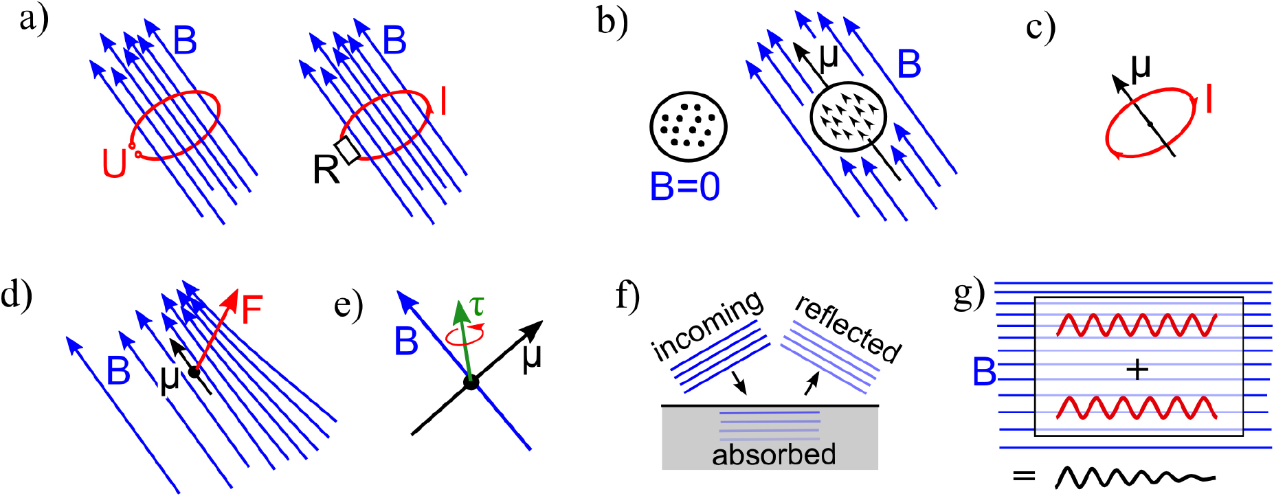 Figure 5. The most important physical interactions in electromagnetic fields. (a) Induced voltages and currents due to a time-varying magnetic field. (b) Magnetisation of materials. (c) The magnetic moment of a current loop. (d) The linear force; the magnetised object is attracted towards increasing magnetic flux density (denser field lines). (e) Rotational force; the torque (green arrow) is orthogonal to the magnetic moment and the magnetic field, i.e. the rotational force (red arrow) is in the plane of the magnetic moment and magnetic field. (f) Absorption (heating) of the RF field on metal surfaces. (g) An illustration of the destructive interference of the resonance signal due to an inhomogeneous magnetic field in a voxel.