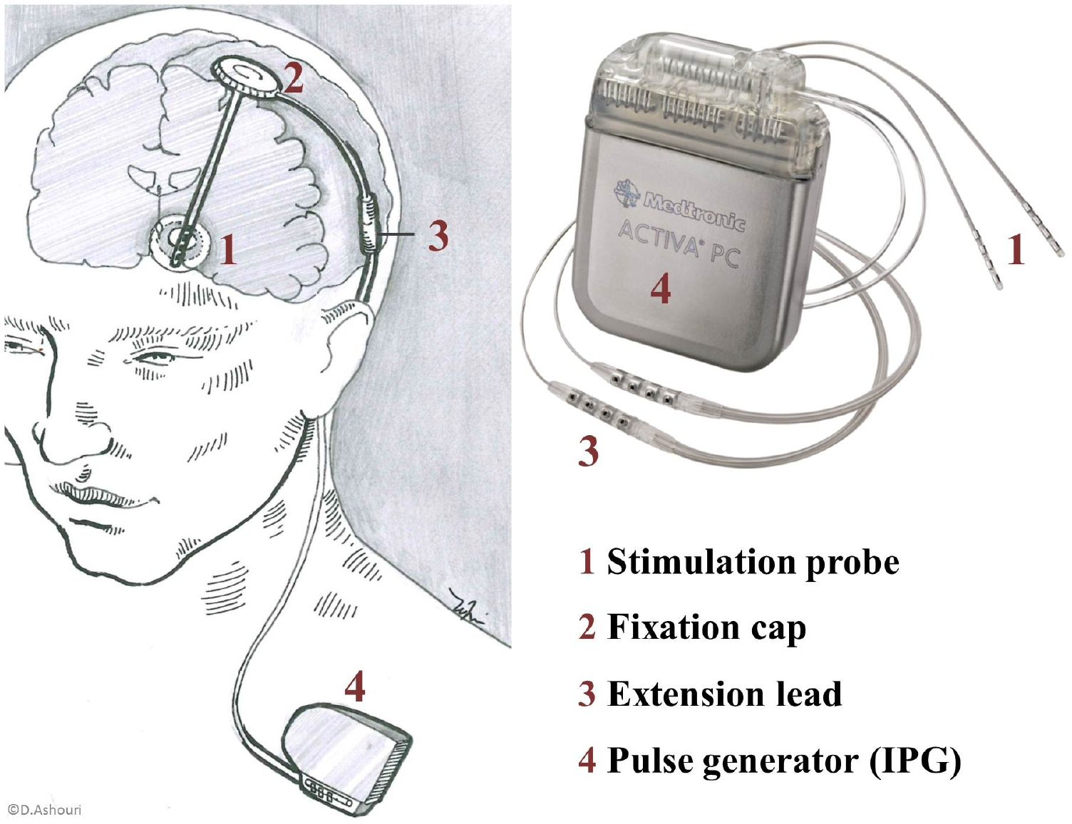Figure 7. An implantable DBS system consists of four components: the stimulation probe (1), fastened in the skull by a fixation cap (2), an extension lead (3), and an implantable pulse generator (4). The stimulation probe is 1.27 mm in diameter and consists of approximately 40 cm long flexible tubing containing wires that are connected to the so-called active sites. These active sites are metal contacts interfacing the electrical components with the target tissue. The extension lead connects the probe wires to the implantable pulse generator, and is available in various lengths. Finally, the implantable pulse generator holds the electronic circuitry and a battery in a hermetic titanium housing, with dimensions on the order of