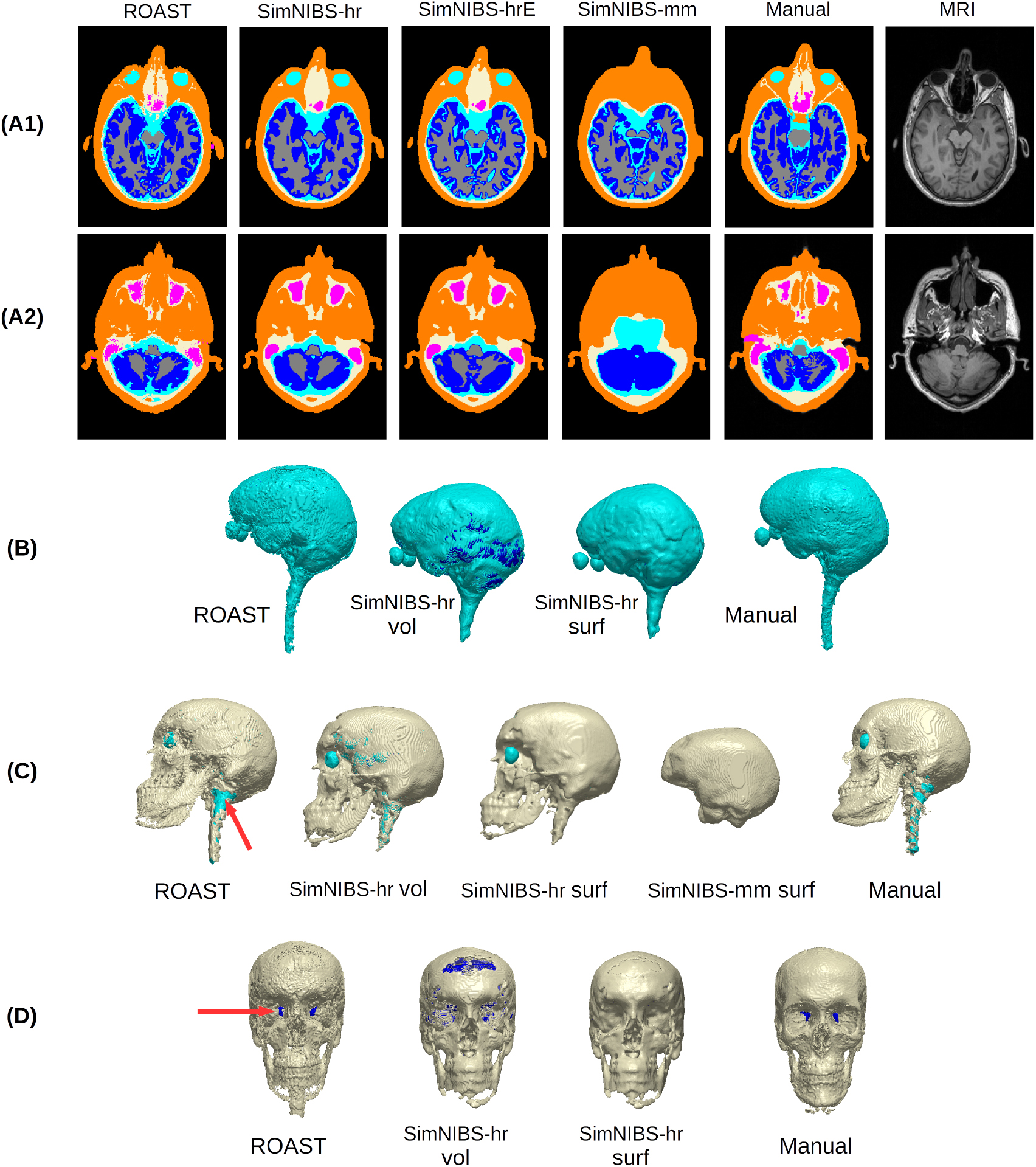 Figure 2. Example brain slices (A1), (A2) and 3D renderings (B)–(D) showing the segmentation from different software tools (ROAST, SimNIBS-hr, SimNIBS-hrE, SimNIBS-mm) and the manual segmentation (Manual) of the individual head S1. For the 3D renderings, both the volumetric (vol) and surface (surf) formats are displayed for the CSF and skull generated by SimNIBS-hr. Red arrows indicate the optic foramen and the foramen magnum. Note that SimNIBS-mm is missing portions of midbrain and spinal cord due to is limited FOV. Refer to figure 1 for the details of the four segmentation methods.