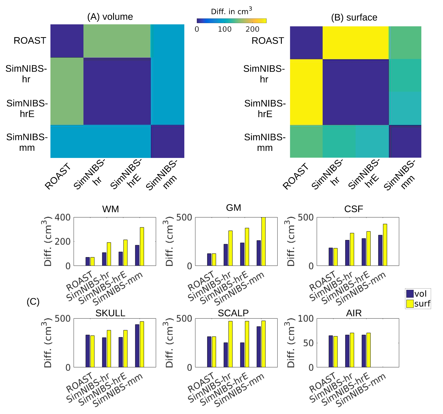 Figure 3. The absolute volumes (cm3) of the segmentation differences between the four methods on the overall segmentation of the individual head (S1) are displayed as matrices for volumetric (A) and surface (B) format. Also the difference for each tissue type for each method compared against the manual segmentation is shown as bar plots (C), also for the volumetric and surface formats. The 'surf' format (yellow bars) for ROAST is in fact the upsampled segmentation results from ROAST. Refer to figure 1 and section 2.2.1 for the details of the four segmentation methods. WM: white matter; GM: gray matter; CSF: cerebrospinal fluid.