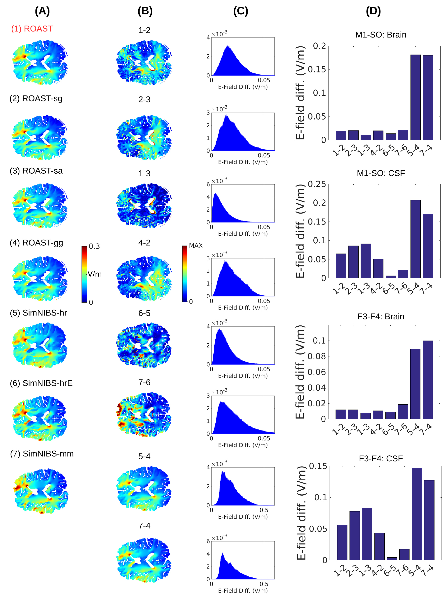The spatial distributions of electric field magnitudes in the brain under M1-SO montage are visually quite similar across these pipelines (figure 4(A)). Note we ran the simulations on the same head as used in section 3.1. We compared eight pairs of pipelines for the electric field in the brain and CSF: