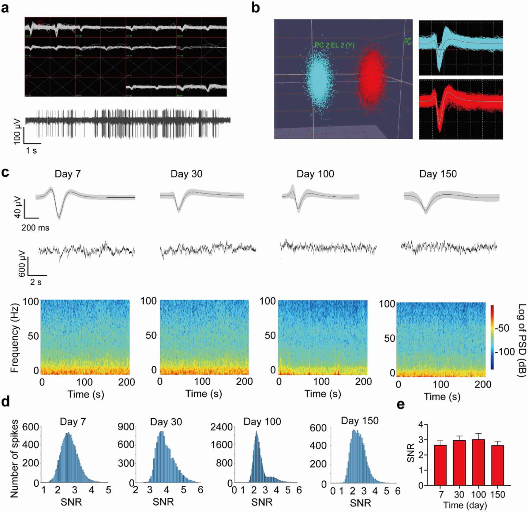 Figure 10. Chronic recording performance of the drivable MEANS in vivo. (a) Presentation of raw recording data. Top: part of the original recording window of the 64-channel neural acquisition processor. Bottom: raw spike continuous signal trace of a 10 s window. (b) Left: two different units in a principal component analysis (blue and red). Right: superimposed waveforms from two different units (blue and red). Unclustered spikes are not shown. (c) Evaluation of long-term stability of electrodes. Top: waveform of a set of neurons recorded from the same channel for 150 days. Bottom: raw LFP trace and spectrograms of the signal recorded for 150 days. (d) SNR of signal recorded for 150 days. For visualization purposes, only the waveforms from days 7, 30, 100, and 150 are shown. (e) The changes of signal-to-noise ratio over time. Each dot presented the average SNR of all the units separated from one mouse. The average SNR included all SNR for all excepted channels unable to detect single units. n = 4 mice. mean ± SD.