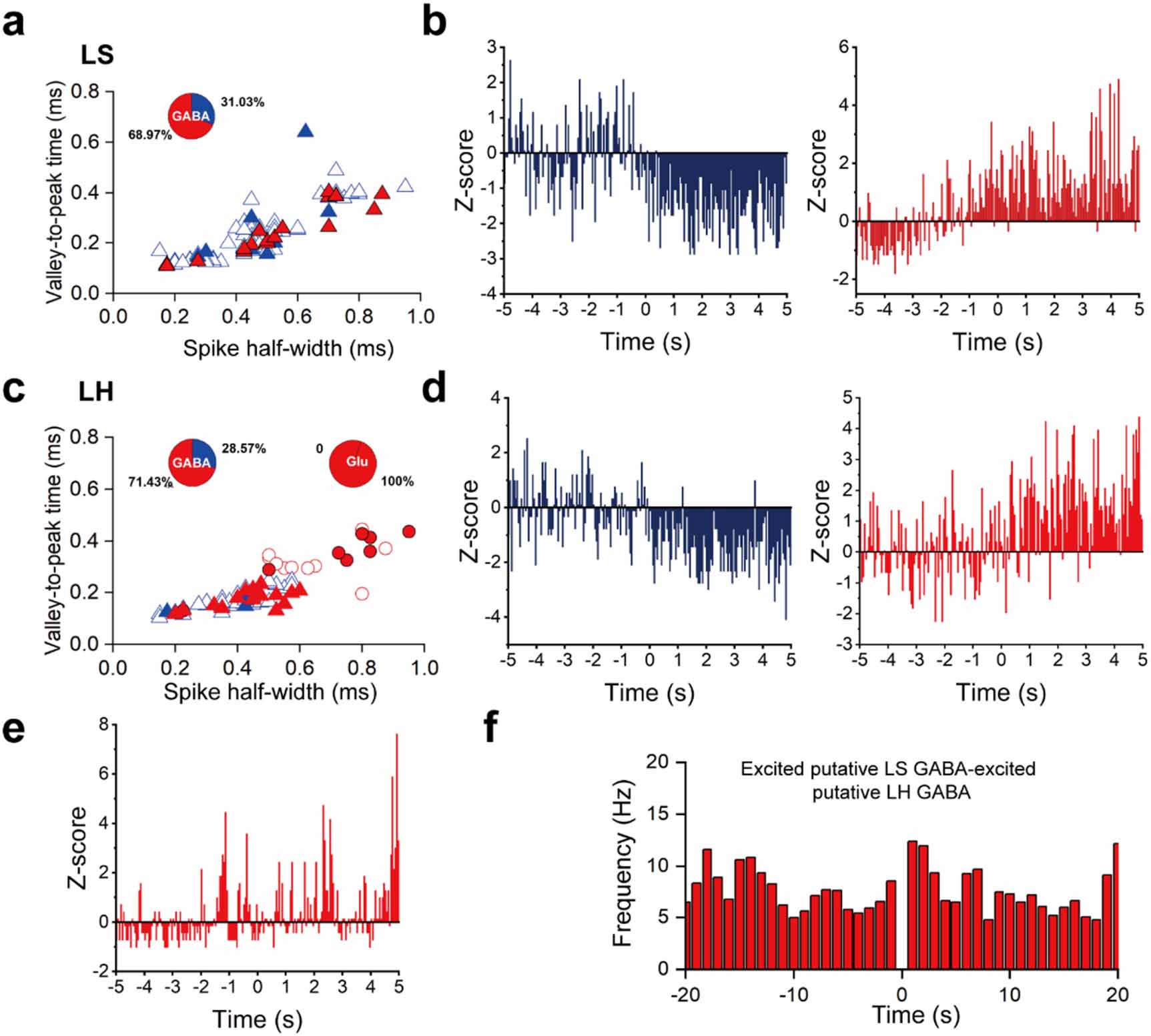 Figure 11. Recording of two drivable MEANS in dLS and LH for neural circuit dissection. (a) LS neurons (n = 87 neurons from four mice) were classified by valley-to-peak time and spike half-width when the mice entered the food zone. Red solid triangle, excited dLSGABA neurons, n = 20; blue solid triangle, inhibited dLSGABA neurons, n = 8, blue hollow triangle, no response dLSGABA neurons, n = 59. (b) Z-score normalized firing rates of inhibited putative LSGABA (left, n = 8 neurons) and excited putative LSGABA (right, n = 20 neurons). (c) LH neurons (n = 90 neurons from four mice; LHGABA, triangle; LHGlu, circle) were classified by valley-to-peak time and spike half-width when the mice entered the food zone. Blue solid triangle, inhibited putative LHGABA neurons, n = 6; red solid triangle or circle, excited putativeGlu/GABA neurons, n = 21. Hollow triangle or circle, no response (d) Z-score normalized firing rates of inhibited putative LHGABA (left, n = 6 neurons) and excited putative LHGABA (right, n = 14 neurons) (e) Z-score normalized firing rates of excited putative LHGLU (n = 7 neurons). (f) The cross-correlation of excited putative LSGABA and excited putative LHGABA.