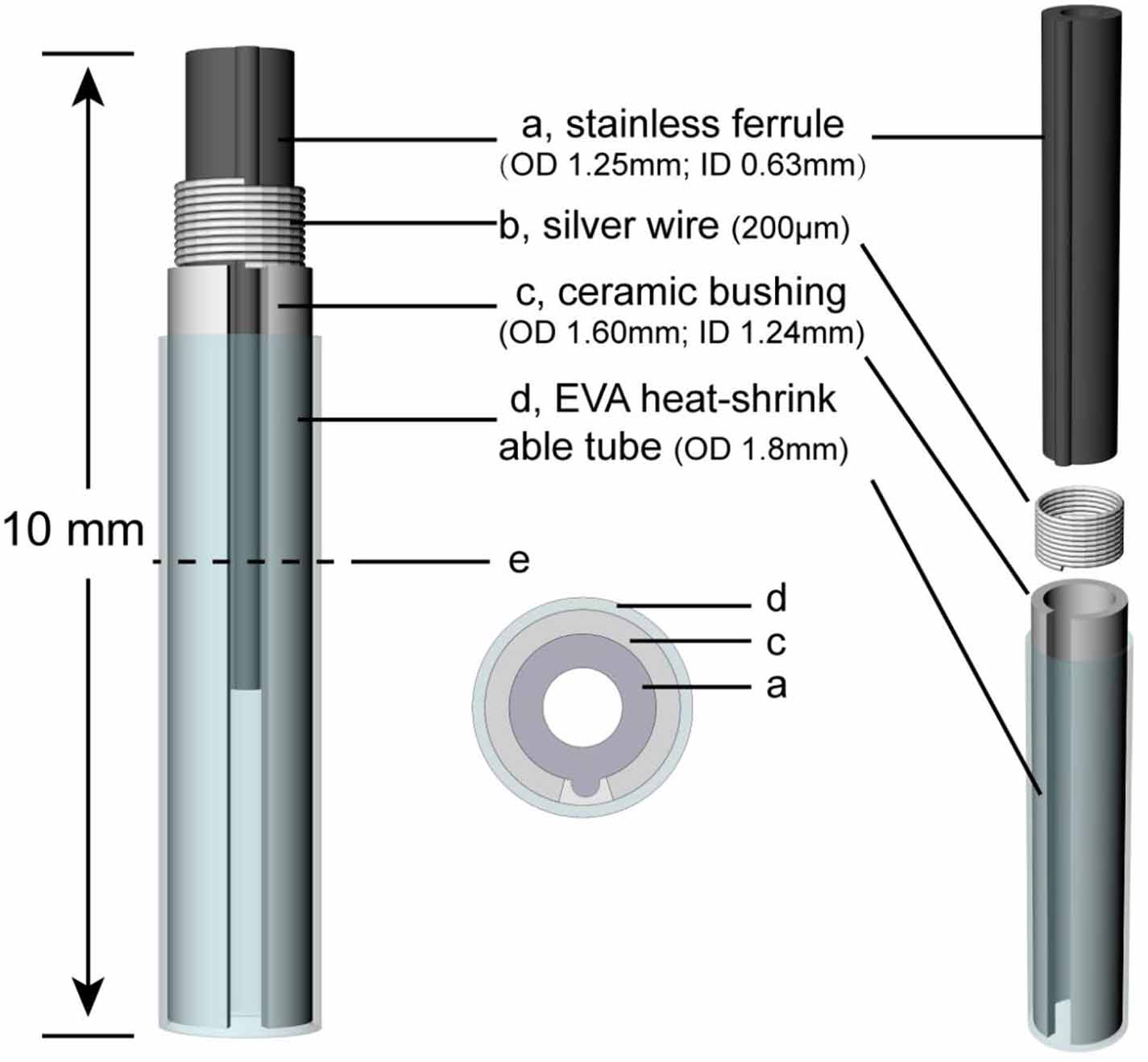 Figure 1 shows a schematic of the proposed drivable component of the drivable MEANS. The drivable component, a three-layer nested construct, described from outside to inside, consists of an ethylene-vinyl acetate copolymer (EVA) heat-shrinkable tube, non-closed loop ceramic bushing (inner diameter, ID 1.24 mm, OD 1.60 mm), and stainless ferrule (ID 0.63 mm, OD 1.25 mm) with a bulge and twining silver wire (OD 0.20 mm). The ceramic bushing is wrapped by the EVA heat-shrinkable tube, which behaves elastically. The role of ceramic bushing serves as a linear track for a stainless ferrule, and the EVA heat-shrinkable tube keeps the track clean. Moreover, half of the EVA heat-shrinkable tube surface will also be embedded in the dental cement during implantation. Thus, the EVA heat-shrinkable tube-ceramic bushing will be fixed in the brain, allowing the stainless ferrule to move in it. The silver wire is tightly twined around and affixed to the stainless ferrule by cyanoacrylate glue to adjust the step distance by controlling the ferrule insertion depth. Cyanoacrylate glue is selected for its ease of use and low ductility; its brittle bonds poorly resist impact loading, making it convenient to remove the silver wire. Thus, the length of the removed silver wire controls the migration distance of the stainless ferrule, with a lap of silver allowing the stainless ferrule to move approximately 0.2 mm. The bulge on the stainless ferrule aligns with the crevice of the ceramic bushing to prevent extra rotation during insertion, driving, and recording.