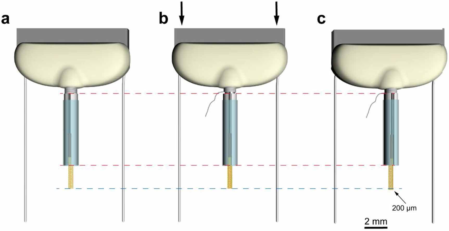 Figure 3. Schematic of the drive. Before drive (a), during drive (b) and after drive (c) are shown here. Parts between the red dotted lines are EVA heat-shrinkable tube and ceramic bushing. The green dotted line highlights the movement of microwire array. Scale bar, 2 mm.