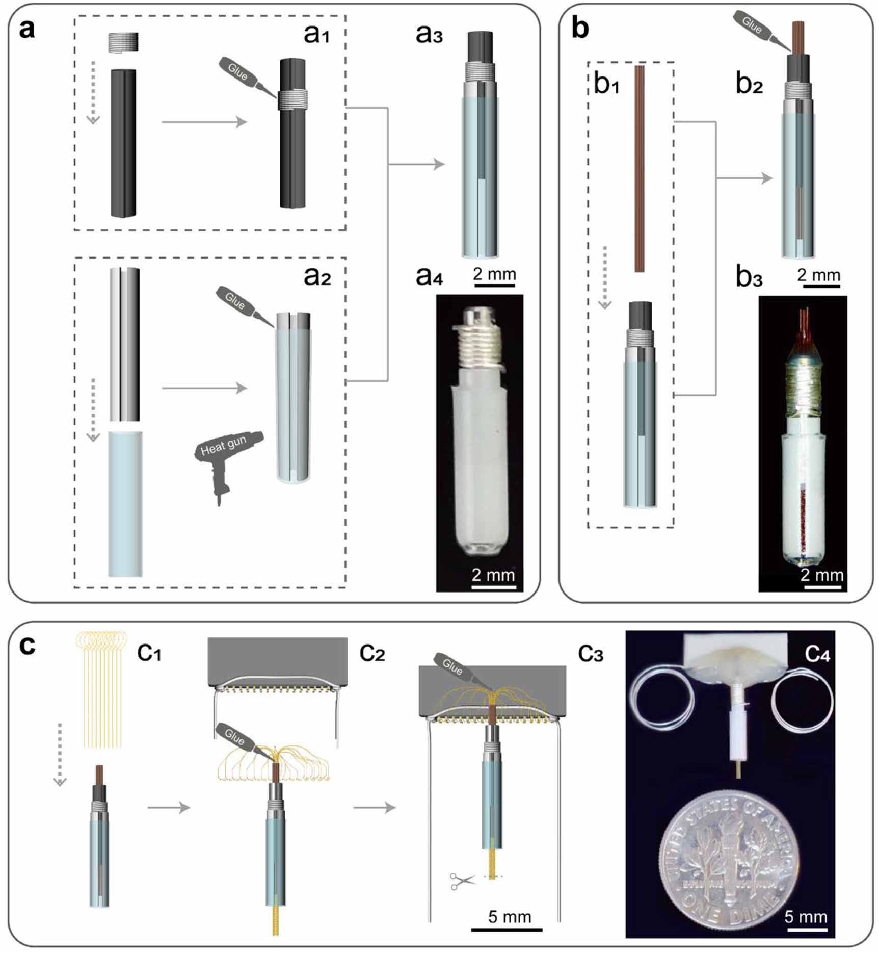 Figure 6. Key processes for the drivable MEANS fabrication. Gray dashed arrows, indication for fabrication processes. Gray solid arrows, indication for insertion directions. (a) The fabrication of the drivable component. The three-layer nested structure was compressed together and silver wire was fixed to stainless ferrule. Lower right corner, prepared drivable component, scale bar, 2 mm. (b) The loading of silicon tubes (supporting component). Lower right corner, prepared drivable component with silicon tubes, scale bar, 2 mm. (c) The loading of stereotrode array and Omnetics connector with reference and ground wires (working component). Lower right corner, comparison of a prepared drivable MEANS and one dime, scale bar, 5 mm.