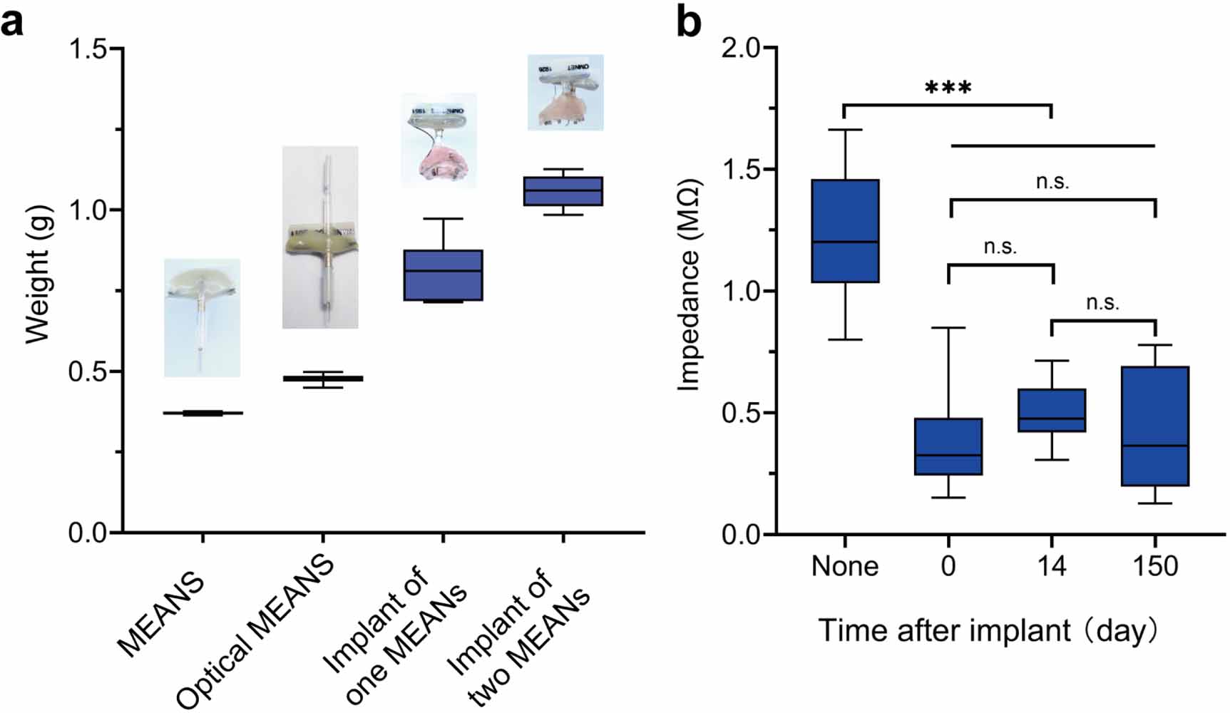 Figure 8. Drivable MEANS with lightweight and appropriate impedance. (a) Drivable MEANS related weight. The fabricated drivable MEANS and optic fiber-integrated drivable MEANS are ∼0.37 g and 0.47 g, respectively (n = 6, n = 6). The explant of one drivable MEANS for one brain region electrophysiological recording and two drivable MEANS for two brain regions electrophysiological recording are ∼0.81 g and 1.02 g, respectively (n = 6, n = 6). (b) Electrochemical impedance at 1 kHz in PBS. The unmodified group shows the impedance of Ni/Cr microelectrodes before modification by platinum plating (n = 13). The day 0 group shows the impedance of the drivable MEANS after modification before implantation (n = 13). The Days 14 and 150 groups show the impedance of the drivable MEANS after implantation for 14 and 150 days, respectively (n = 14; n = 14). The electrodeposition of platinum plating significantly decreased the impedance of Ni/Cr microelectrodes. Mean ± SD. Two-sample t-test. ***, P < 0.001.