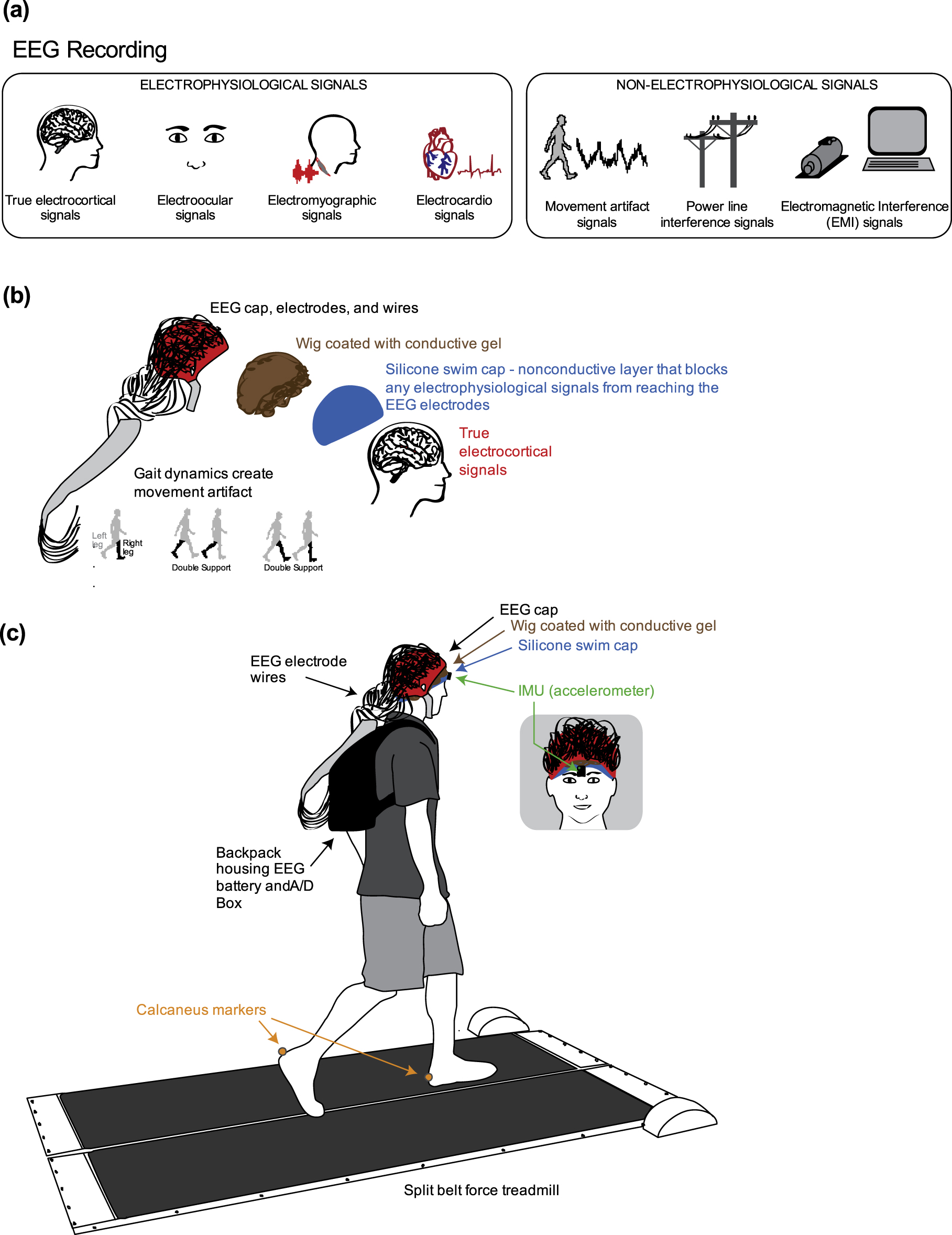 Figure 1. Conceptual schematic and experimental set up. (a) All of the signals that contribute to scalp EEG recordings, categorized as electrophysiological or non-electrophysiological. (b) Schematic of the methodological concept for isolating and measuring gait-induced movement artifact in EEG recordings. A silicone swim cap blocks true electrocortical signals, while a simulated conductive scalp allows the electrodes to measure voltage differences resulting from gait dynamics. (c) Schematic of the experimental setup. Subjects walked at four speeds (0.4, 0.8, 1.2, and 1.6 m s−1) on a custom split-belt force measuring treadmill. Trajectories of the calcaneus markers were recorded. An inertial measuring unit (IMU) with a tri-axial accelerometer placed on the forehead above the nose measured accelerations of the head during walking.