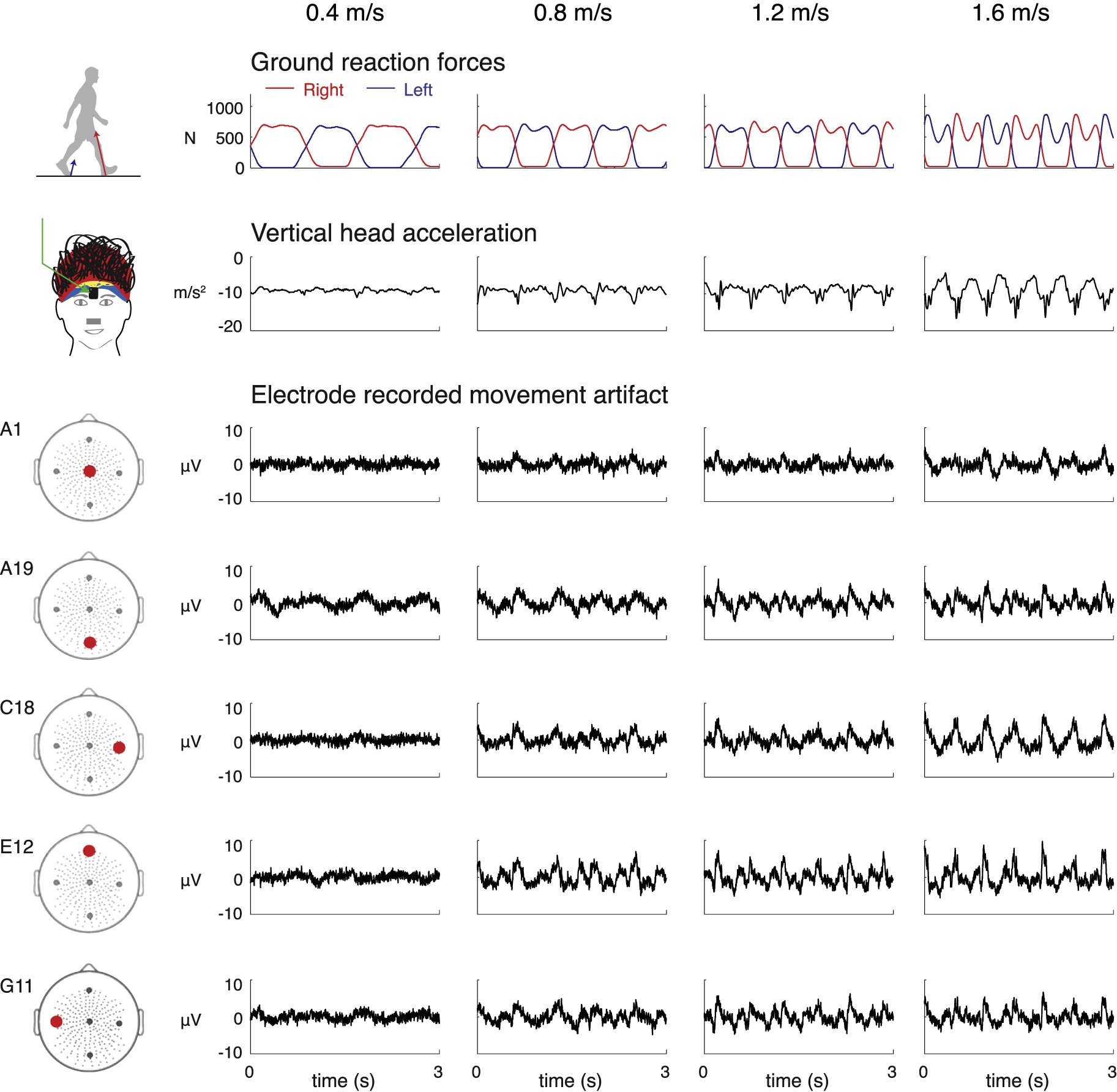 Figure 2. Time courses of movement artifact and accelerometer data. Time courses of the ground reaction forces for the right and left legs, head accelerations (vertical, mediolateral, and anterior–posterior), and movement artifacts recorded in five electrodes (A1, A19, C18, E12, and G11) for the four walking speeds (0.4, 0.8, 1.2, and 1.6 m s−1) for a single subject.