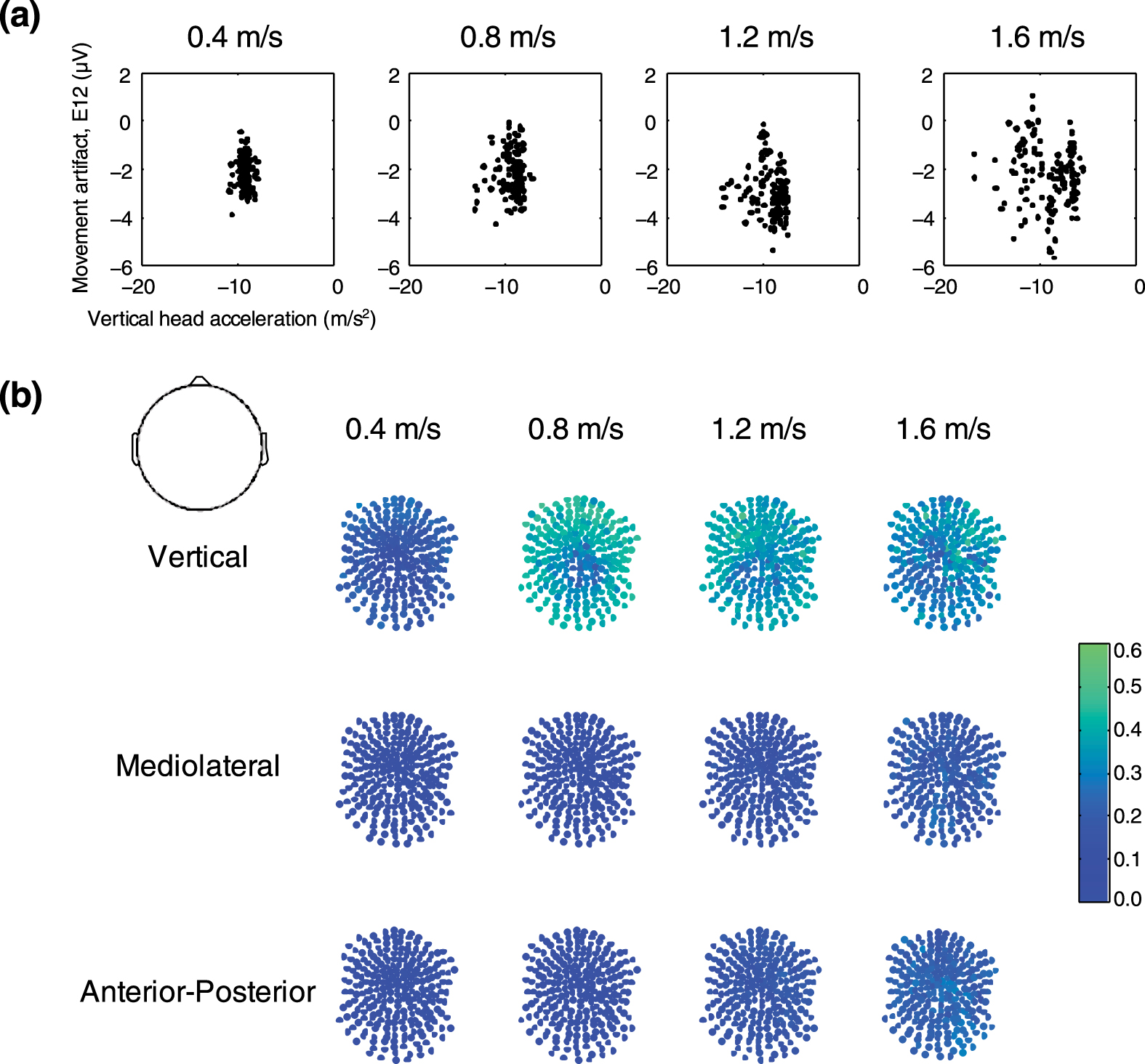 Figure 3. Correlations between the accelerometer and the frontal electrode movement artifact. (a) Vertical head acceleration was plotted against movement artifact recorded in the frontal electrode (E12) for a stride of data for a single subject (same data as in figure 2). (b) Correlation coefficients between all three head accelerations and each electrode movement artifact signal were generally <0.4. Dark blue represents uncorrelated signals (correlation coefficient = 0.0) and green equals a correlation coefficient of 0.6.