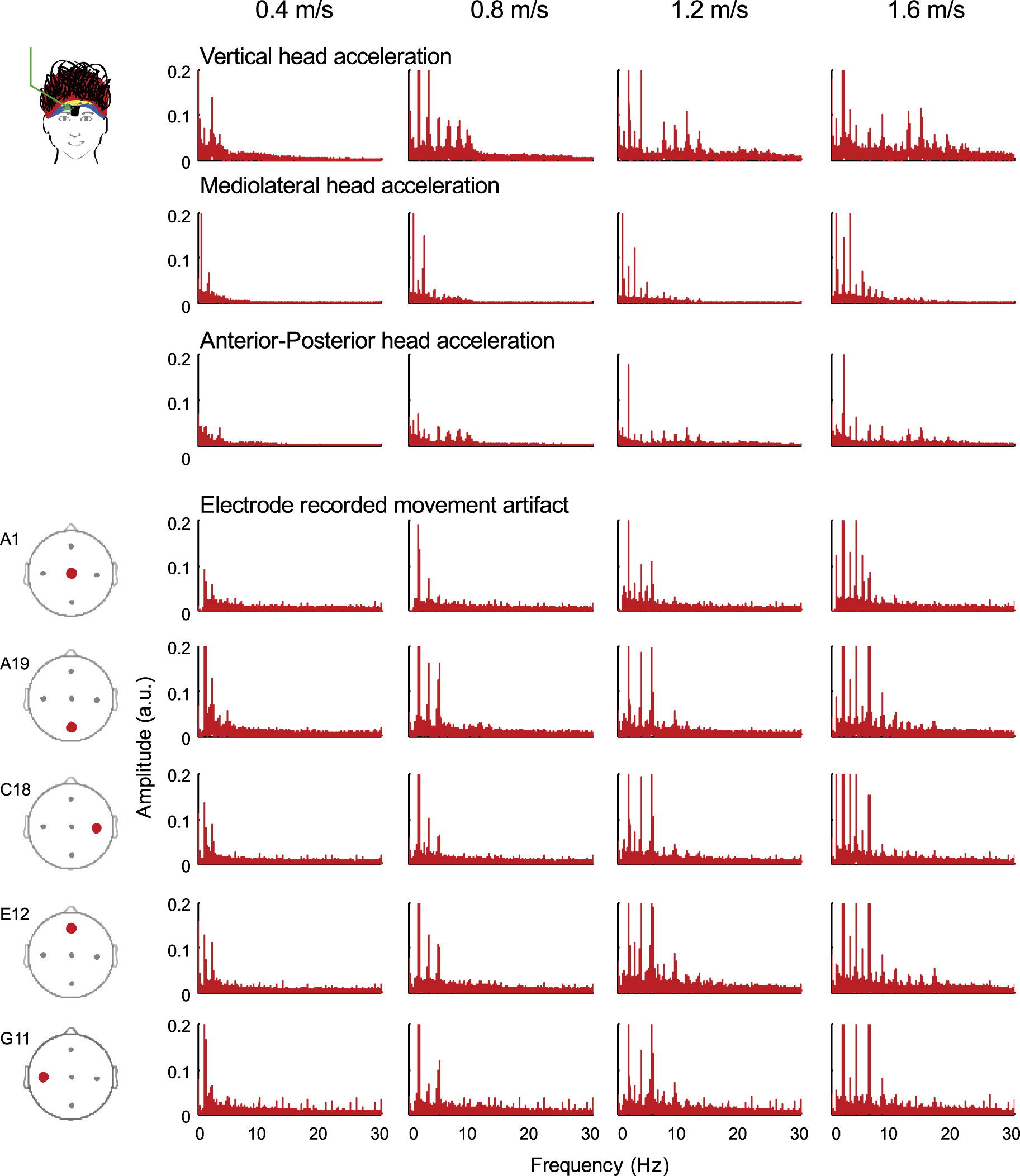 Figure 4. Frequency spectra for the accelerometer and electrode movement artifacts. Frequency spectra of the head accelerations (vertical, mediolateral, and anterior–posterior) differed from the spectra of the electrode recorded movement artifacts (A1, A19, C18, E12, and G11). Each column is a walking speed, increasing from left to right.