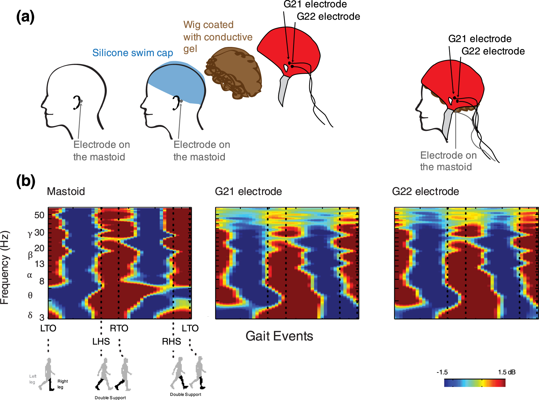 Figure 8. Schematic of the setup and ERSP plots for the mastoid experiment. (a) To examine the electrode/human skin interface, an electrode was placed on the left mastoid underneath the swim cap. To examine the electrode/simulated scalp interface, the two electrodes closest to the left mastoid, G21 and G22, were used to measure movement artifact from the simulated scalp comprised of the wig coated with conductive gel placed over the swim cap. (b) ERSP plots for the mastoid, G21, and G22 electrodes show similar broadband spectral fluctuations between 3 and 64 Hz.