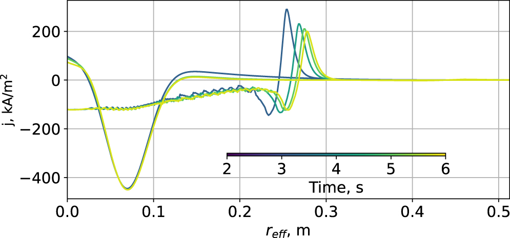 Standard image High-resolution imageIn the beginning of the experiment, ECCD is applied around the minor radius reff ≈ 0.1 m. Once the ECCD is switched on, the ohmic plasma response current is generated, which initially shields the ECCD entirely. This ohmic response current subsequently decays on the resistive timescale, resulting in a growth of the total current.