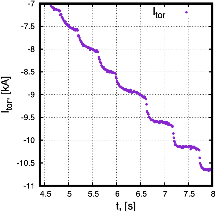 Figure 12. Time zoom into figure 4, toroidal current evolution. Current 'steps' become noticeable at 6.6 s.