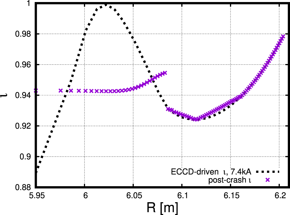 To obtain a realistic initial pre-crash equilibrium with significant toroidal current, we produce a sequence of free-boundary VMEC equilibria with varying toroidal current and toroidal current profiles. The goal is to find an equilibrium with an ι-profile which touches unity (consistent with the stability analysis discussed above) and corresponds to a substantial total toroidal current. The current diffusion process was simulated using the NTSS code [20], and the ECCD profile was taken to match the experimentally observed toroidal current within the model discussed in section 3 (varying amplitude and position of the current drive). Since the pressure gradient in these experiments is small, almost no contribution from the bootstrap current is expected, and this current was thus omitted in the calculations. A result of such calculations is presented in figure 14 purple curve. This case corresponds to an experimental equilibrium with 9.8 kA of net toroidal current.