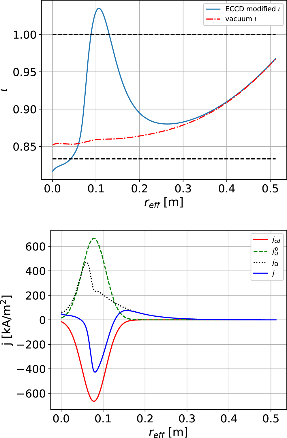 Figure 1. (Top plot) Vacuum ι-profile (red) and ECCD-modified ι-profile (blue) after 0.2 s of current drive (plasma β = 0) at reff ≃ 0.08 m. The resonances ι = 1 and ι = 5/6 are marked in green. (Bottom plot) Profiles of current densities for the driven jCD (red) and ohmic screening jscreen (