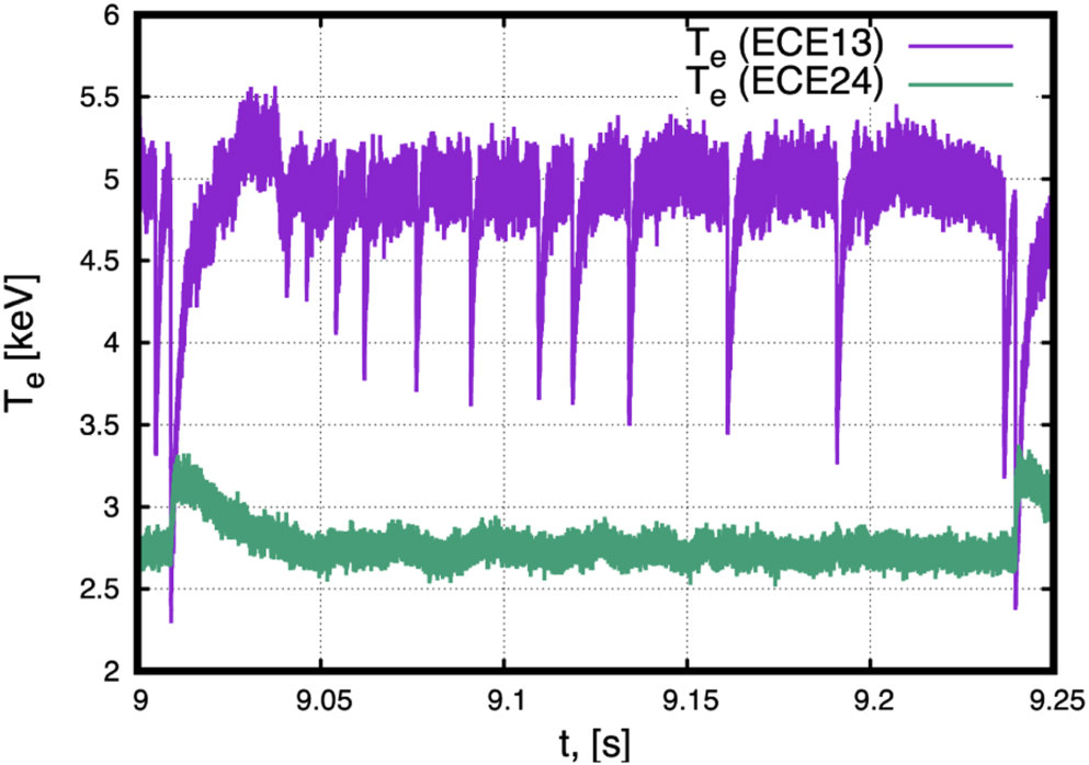 Standard image High-resolution imageFigure 4 shows time traces from three ECE channels: 13, 24 and 29 (ECE 29 views the plasma edge and the resonance is located at r/a = 0.95) and the toroidal current for the second discharge (XP20171207.008). Here, the last 5 crashes (at 6.5–9 seconds) apparently encompass the entire plasma. Whereas earlier crashes had a minor effect on the outermost ECE channel, the last 5 ones register an increase in electron temperature (approximately 100%), suggesting that hot plasma is expelled all the way to the edge, see figure 5.