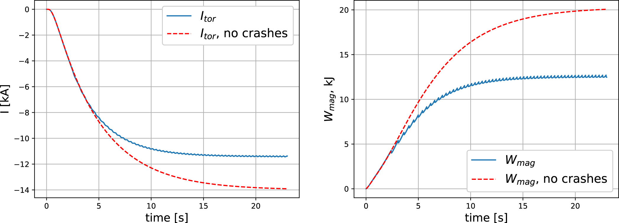 Figure 8. (Left plot) Resistive current evolution modeled with (blue) and without (red, dashed) sawtooth crashes. (Right plot) Total magnetic energy (associated with the toroidal current) modelled with (blue) and without (red, dashed) crashes.