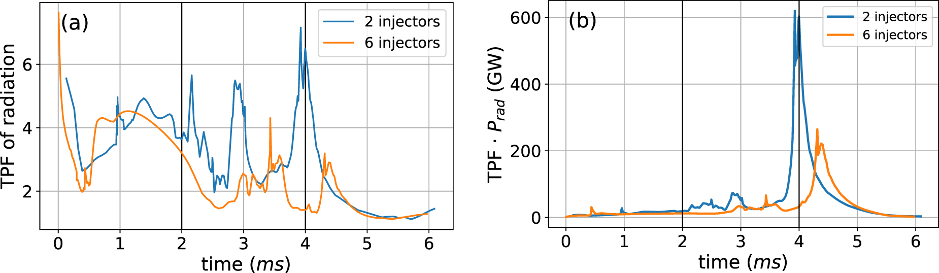 Figure 10(a) shows the TPF as a function of time in simulations with two and six injectors at the same nominal injection rate. At the beginning of the injection at t = 0 the TPF is very large, as the impurities are most localized (and so is radiation) at this moment. Since the total amount of impurities in the plasma is very small at this early stage,
