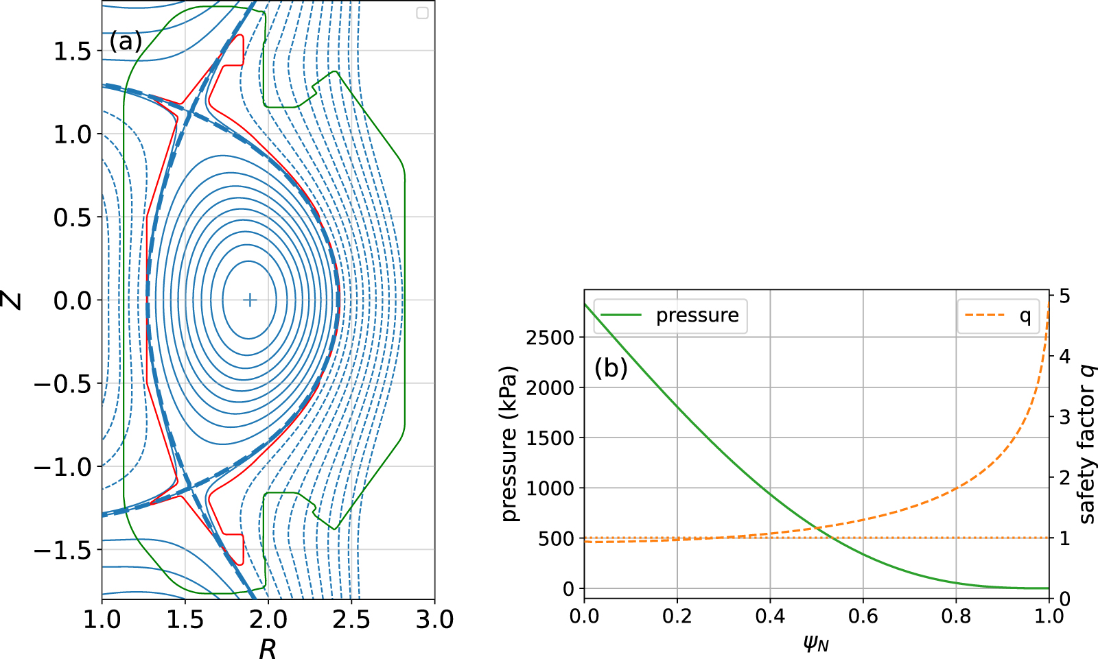 Figure 1. (a) Flux surfaces of the initial equilibrium shown together with the inner wall and the outermost shell of the vacuum vessel. (The full mesh and wall structures are illustrated in figure 2.) (b) Pressure p and safety factor q profiles in the SPARC PRD equilibrium used in our disruption mitigation simulations.