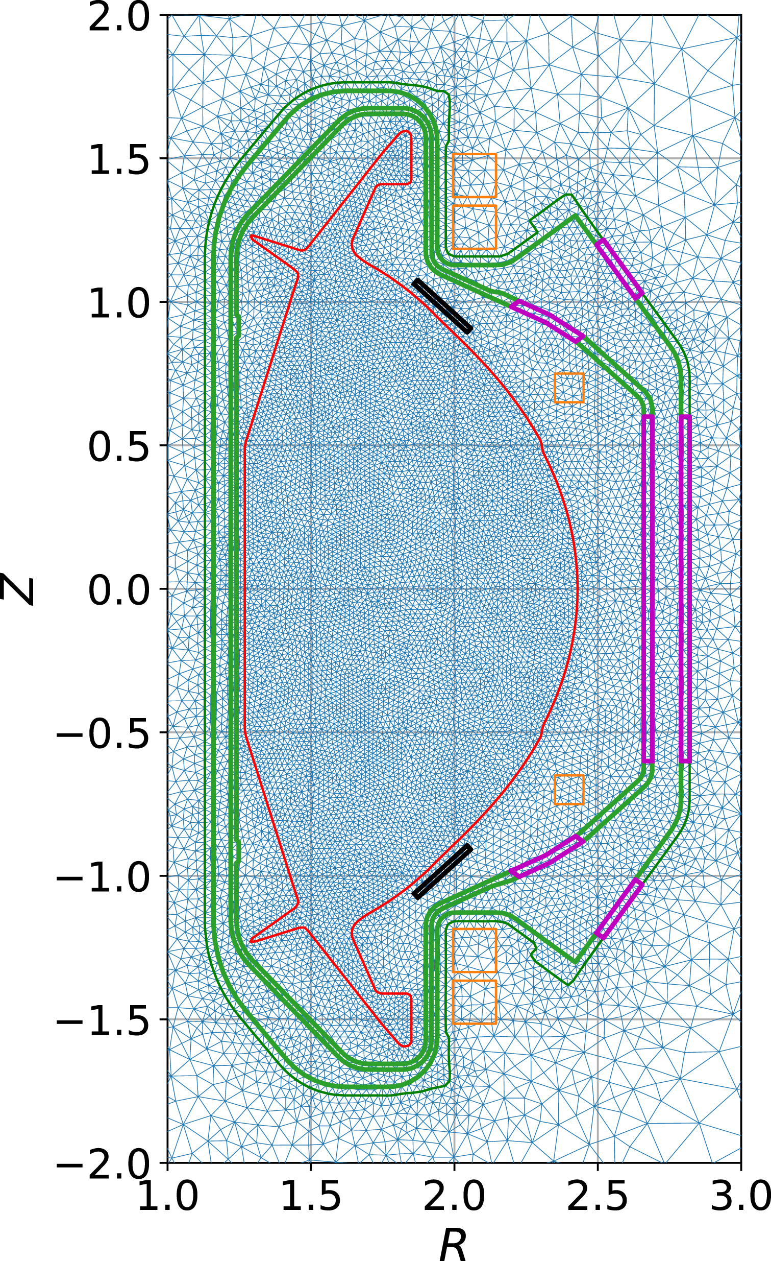 Figure 2. Unstructured mesh showing the plasma region within the first wall (red) with relevant surrounding conducting structures. Two shells of the vacuum vessel are shown in green, and the passive plates in black. The purple lines indicate the location of the ports, where anisotropic resistivity is used. Magnetic field coils are plotted in orange. Note that the poloidal field and center stack coils lie within the computational mesh outside of the shown area.