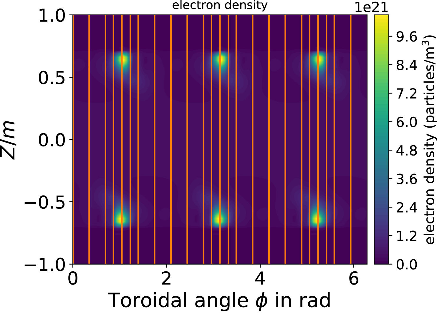 Standard image High-resolution imageFigure 3. Electron density as a function of the toroidal angle φ and Z at fixed R = 2.18 m showing the location and size of the gas injectors. The orange lines indicate the position of the 24 toroidal planes, and how they are more densely packed around the injector sites than in between.