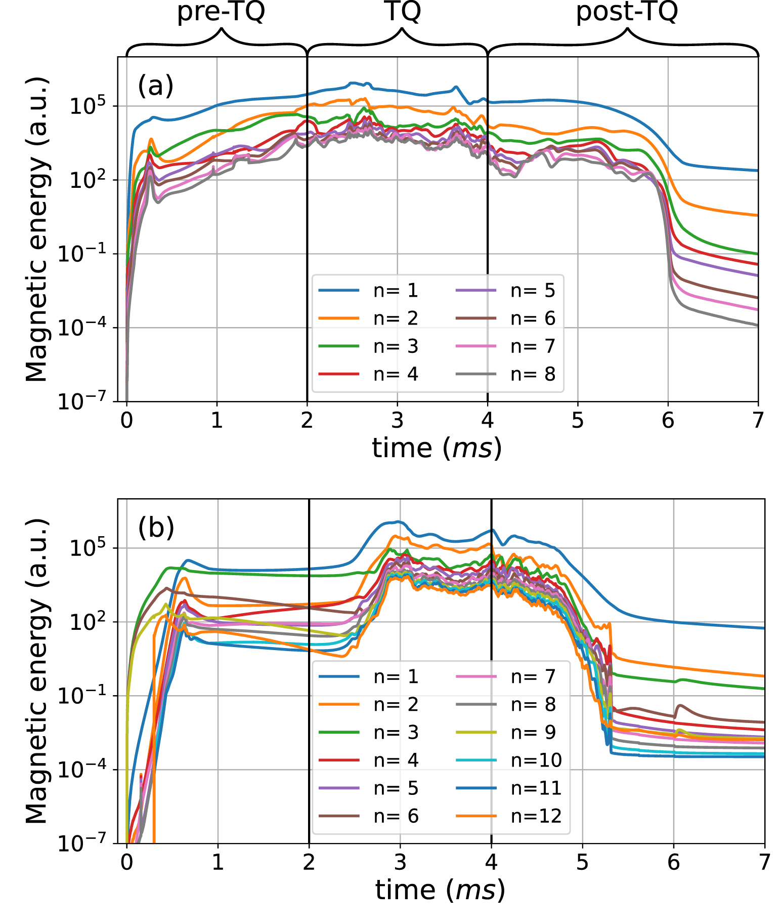 Figure 4. Magnetic energy associated with different toroidal modes. Low-n instabilities grow early due to the gas plumes and sawtooth instability. The black lines indicate the approximate beginning and end of the thermal quench, during which strong MHD activity is seen. (a) Simulation with two injectors. (b) Simulation with six injectors. Both at the same total nominal injection rate of