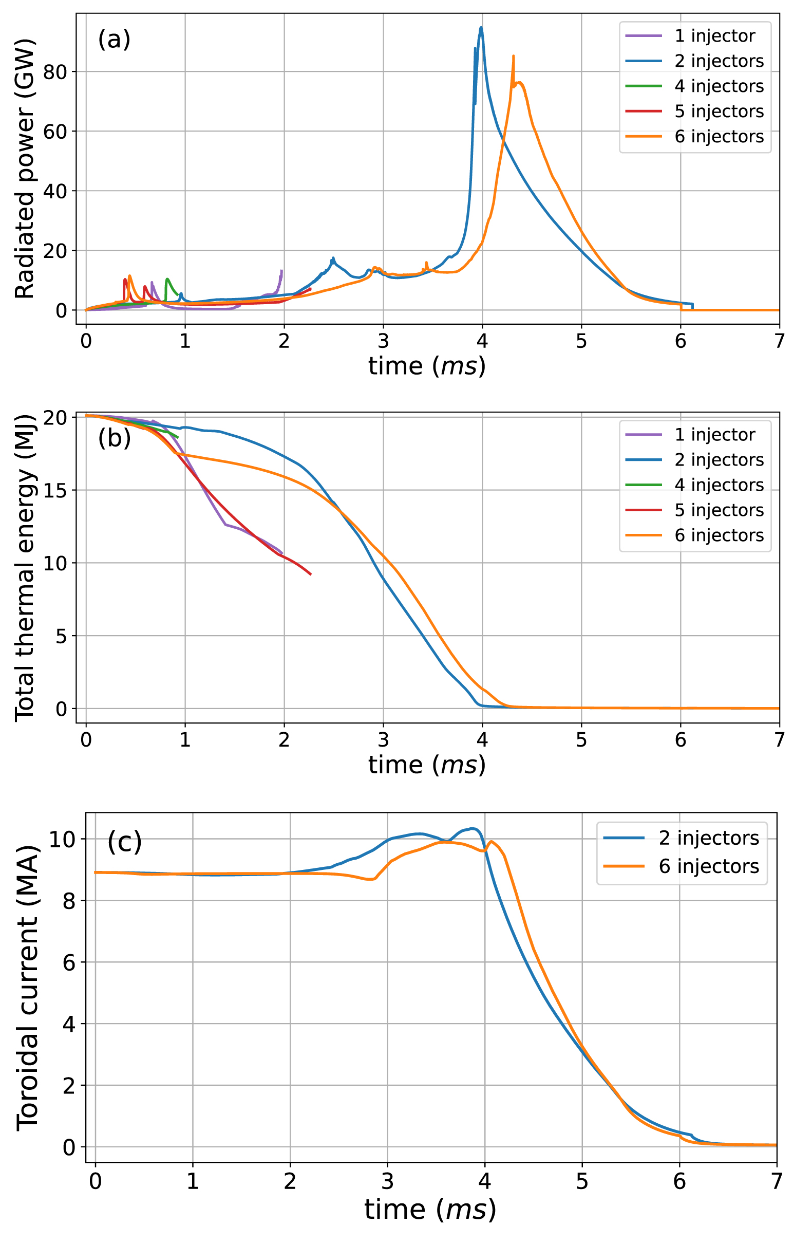 Note that the cases with one, four and five injectors experienced difficulties converging around the start of the TQ and were not continued as the cases with two and six injectors represent injection from one and three toroidal locations, respectively. The case with four injectors at two toroidal positions was considered an alternative scenario, and with its toroidal spacing of