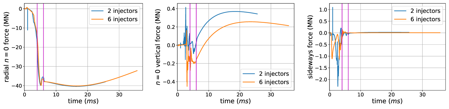 ms on SPARC. The axisymmetric vertical force is two orders of magnitude smaller than the radial force, and thus differences between the two injector and six injector cases can be ignored. The non-axisymmetric sideways force (in horizontal direction) differs in the two considered injector scenarios. With only two injectors the force reaches peak values of above 2 MN, whereas with the full six injector layout the force is only about half of this value. However, the sideways force is one order of magnitude smaller than the axisymmetric radial force and thus in terms of the wall forces the six injector case performs only marginally better.