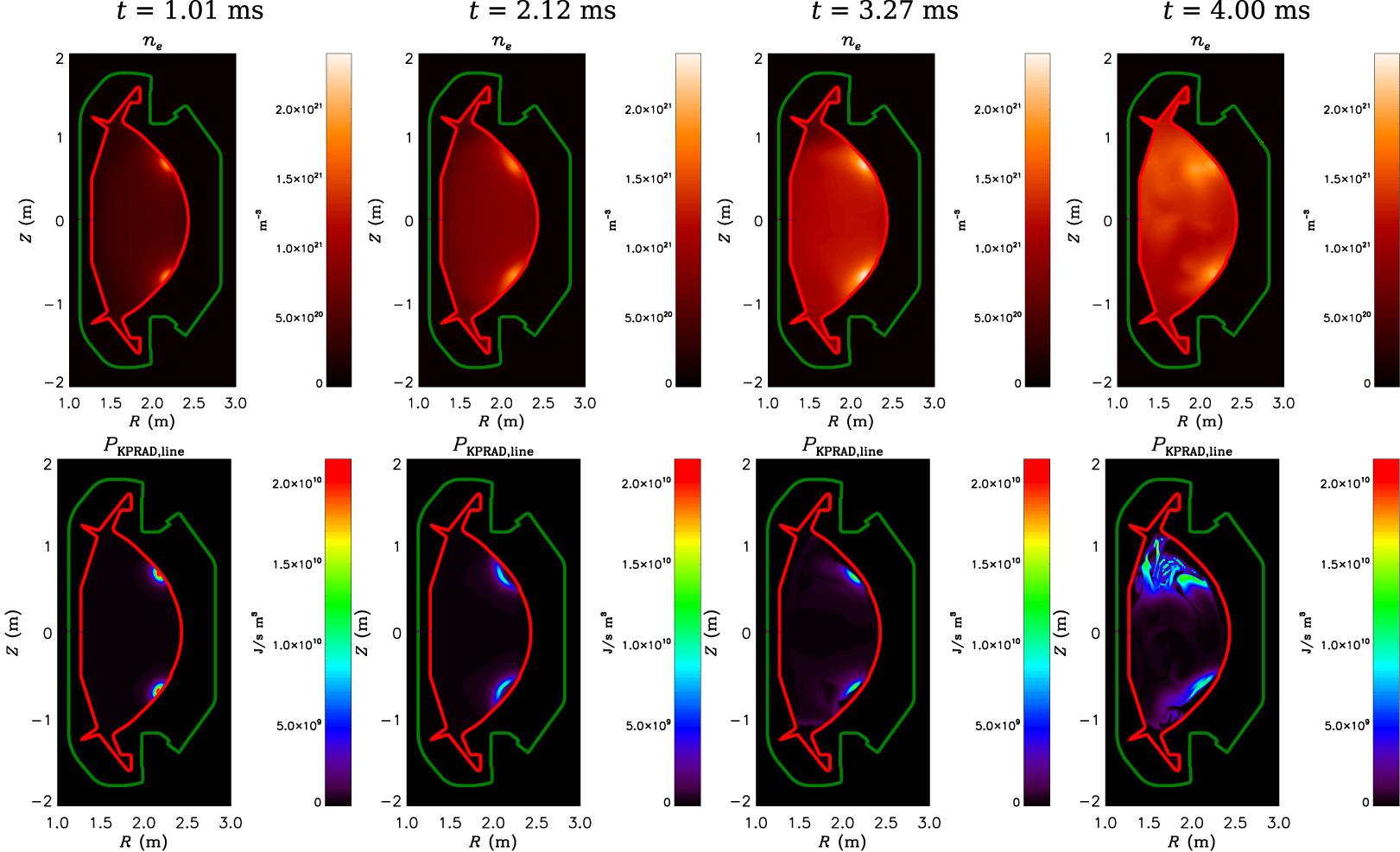 Atomic processes such as ionization, recombination and radiation are included via the KPRAD module [22], which has been coupled with M3D-C1 [15]. This model does not assume a coronal equilibrium. Instead ionization and recombination determine the impurity charge state evolution. The radiated power, associated with charge state k is calculated as