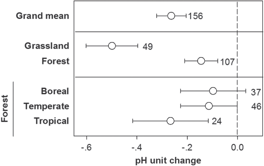 Figure 1. Soil pH unit changes with N addition at global scale and across different ecosystems. Dots represent soil pH unit changes with 95% confidence intervals (CI). If the 95% CI does not overlap 0, they are significantly affected by N addition at α = 0.05. The dash vertical line is drawn indicating soil pH unit change = 0. The number next to the dots is the sample size of each variable. The calculation was based on the formula of log10(H+treatment/H+control) = log10(H+treatment) – log10(H+control), which indicates pH unit change (pHcontrol – pHtreatment) impacted by N addition. Notably, the data in the graph is presented by pHtreatment – pHcontrol.