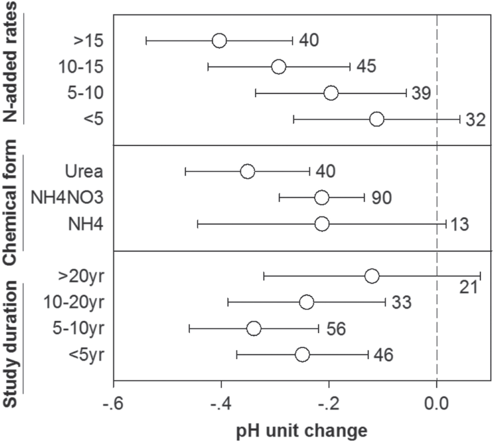 In natural conditions before the Industrial Revolution, the acidification rate in soils is rather low with over hundreds to millions of years. However, at a global scale we found that N addition significantly reduced soil pH by 0.26 in terrestrial ecosystems. This decreased magnitude is lower than a reduced pH of 0.50 reported in Chinese agricultural systems from the 1980s to the 2000s (Guo et al 2010). The different responses of acidification between agricultural systems and non-agricultural ecosystems may be due to more use of N-fertilizer in crop systems (above 50 g m−2 yr−1) than that in non-crop ecosystems (ranging from 1 to 30 g m−2 yr−1) (Rothwell et al 2008, Guo et al 2010). Moreover, a recent meta-analysis revealed that repeatedly harvesting plant biomass can lead to soil acidification (Berthrong et al 2009).