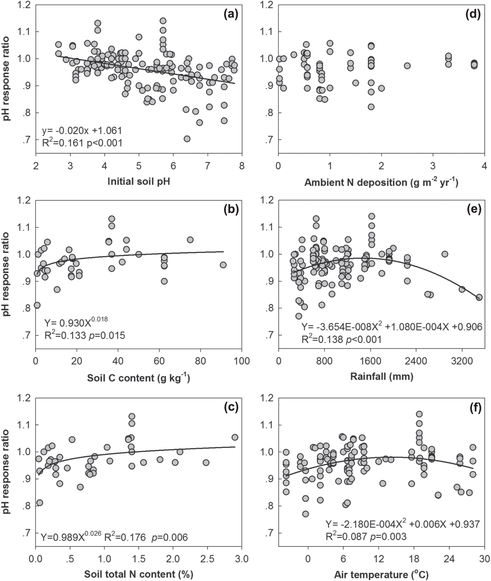 Figure 3. Relationships of soil pH response ratios with initial soil pH (a), soil C content (b), soil total N content (c), ambient N deposition (d), rainfall (e) or temperature (f).
