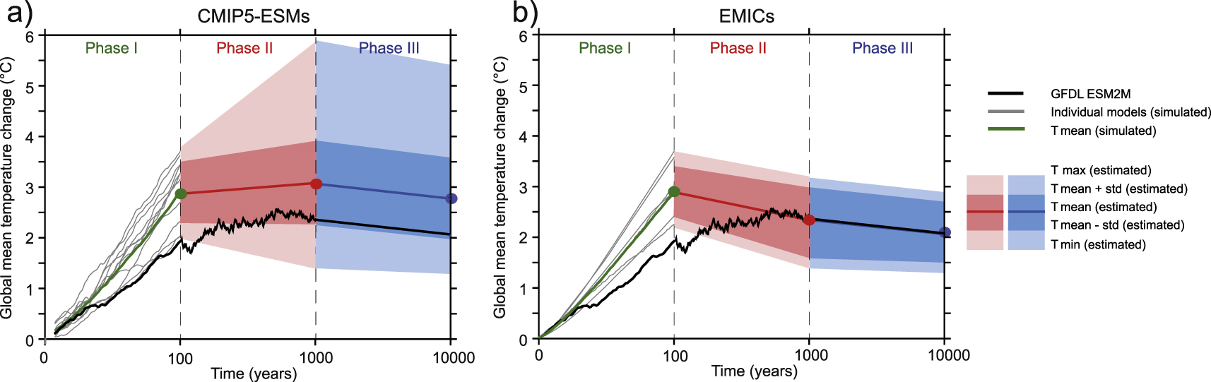 Figure 2. Global mean temperature changes simulated (phase I) and estimated (phases II and III) by (a) 12 CMIP5–ESMs and (b) 8 EMICs. Gray lines in phase I indicate the simulated temperature responses of the individual models, whereas the green, red and blue lines in phase I–III are the simulated and estimated multi-model mean temperature responses. The simulated (phase I and II) and estimated (phase III) temperature response in GFDL ESM2M is shown in black color. Note that the uncertainty ranges are calculated differently for CMIP5–ESMs and EMICs as the airborne fraction of anthropogenic CO2 emissions in year 1000 was not available for the CMIP5 models. For CMIP5–ESMs: dark red and dark blue colors in phase II and III indicate the one standard deviation uncertainty range among the models using the multi-model mean af1000 from the EMICs, and the light red and light blue colors in phase II and III indicate the maximum and minimum values when using the full af1000 range from the EMICs. For EMICS: dark red and dark blue colors in phase II and III indicate the one standard deviation uncertainty range among the models using the individual modeled af1000, and the light red and light blue colors in phase II and III indicate the maximum and minimum values when using individual modeled af1000.