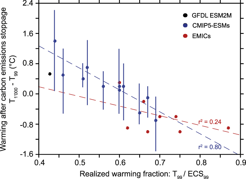 Figure 3. Relationship between the realized warming fraction, T99/ECS99, in year 99 and the global mean temperature change over the period 99–1000 (T1000–T99) after carbon emissions tape off. The black point indicates the GFDL ESM2M, blue points the CMIP5–ESMs, and red points the EMICs. The vertical blue bars for the CMIP5–ESMs indicate the uncertainty range when using T1000 with the minimum and maximum airborne fraction of anthropogenic CO2 as simulated by the EMICs (afmin and afmax; supplementary table 1). The red and blue lines show the linear regression lines using the CMIP5–ESMs and the EMICs, respectively.
