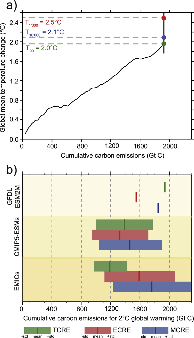 Figure 4. (a) Relationship between global warming and cumulative carbon emissions as simulated and estimated by GFDL ESM2M. Temperature changes in year 99, year 1000 and year 10 000 are explicitly marked with green, red and blue points and horizontal dashed lines. (b) Cumulative carbon emissions to remain below 2 °C global warming as simulated and estimated by GFDL ESM2M, CMIP5–ESMs and EMICs for TCRE, ECRE, and MCRE. The light color bands indicate the uncertainty range when using one standard deviation between the models. For the CMIP5–ESMs a mean airborne fraction of anthropogenic CO2 emissions of 0.25 as simulated by the EMICs is assumed. The uncertainty ranges would be larger when also using the full range of airborne fractions as simulated by the EMICs.