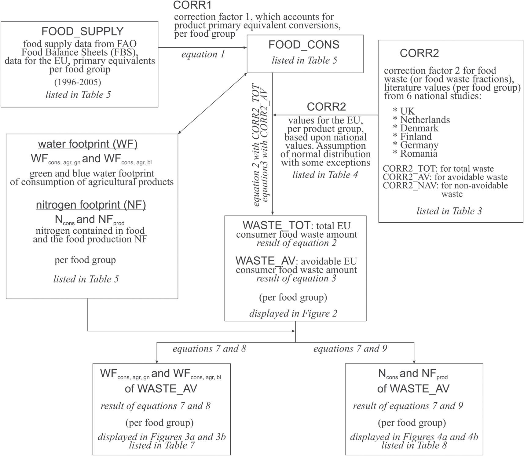 | with | WASTE_AVCORR = | Corrected amount of avoidable consumer food waste to relate to the resource footprint (WF or NF) of WASTE_AV | |
