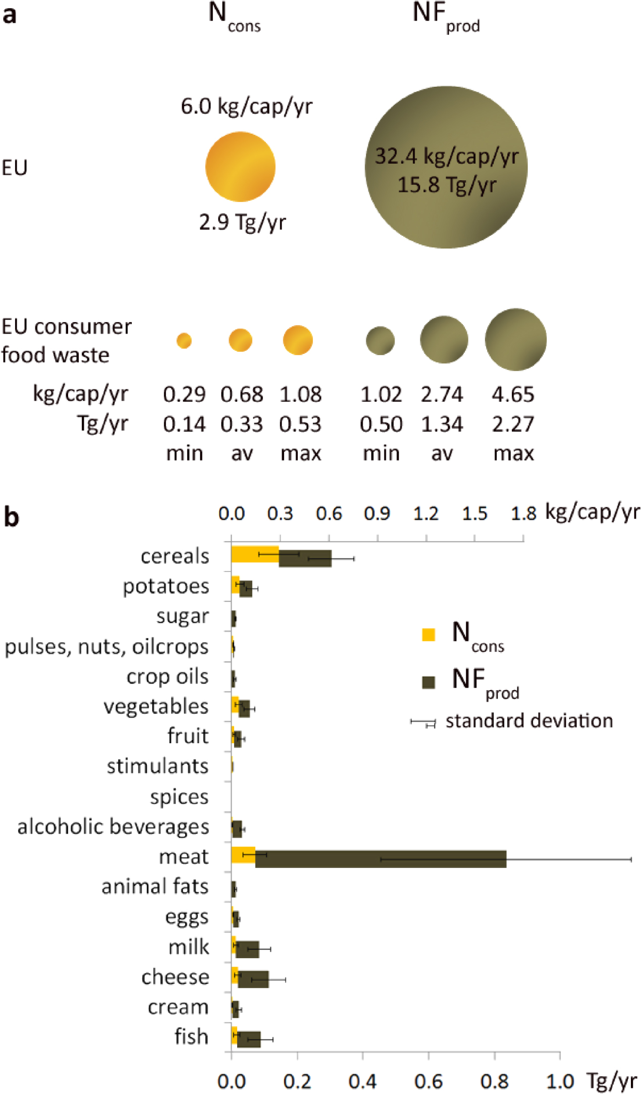Figure 4. The Ncons and NFprod related to EU consumer avoidable food waste for the period 1996–2005: (a) absolute (Tg/yr) and per capita volumes (kg/cap/yr) of the Ncons and NFprod for EU food consumption and consumer food waste; the areas of the circles are scaled according to the volumes; (b) the average (with indication of the standard deviation) EU consumer food waste Ncons and NFprod for different product groups in per capita (kg/cap/yr) and absolute (Tg/yr) volumes.