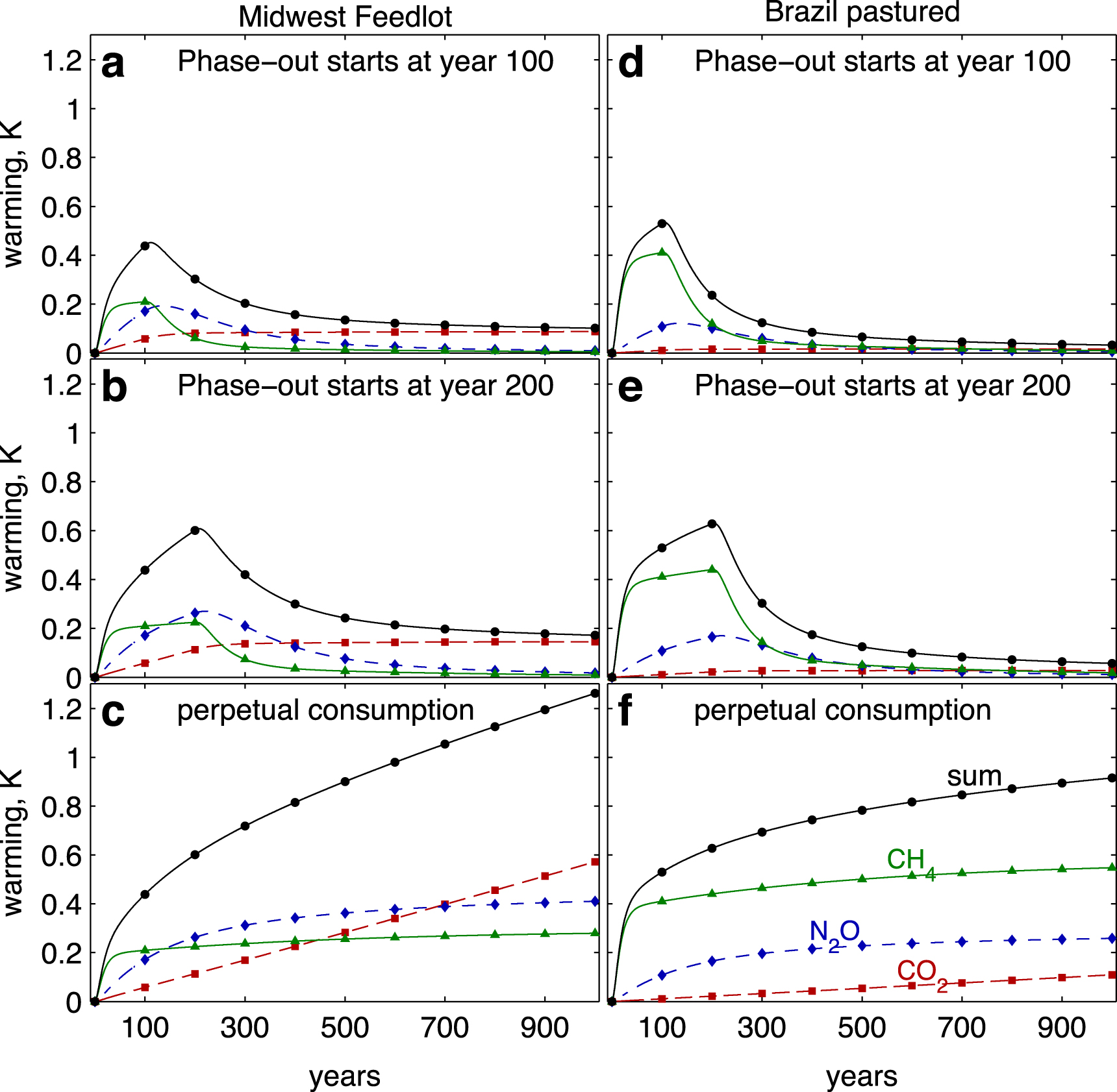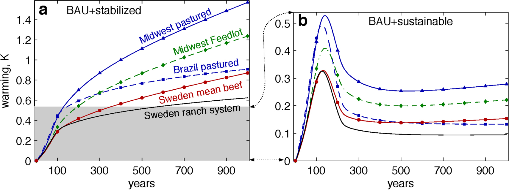 emissions lead to a comparitively high degree of irreversible warming in cases where initially high consumption rates are phased out, and comparitively high secular warming growth on the millennial time scale in any scenario with continued beef production. The midwest pastured example shows that ‘grass-fed’ systems do not necessarily produce low
