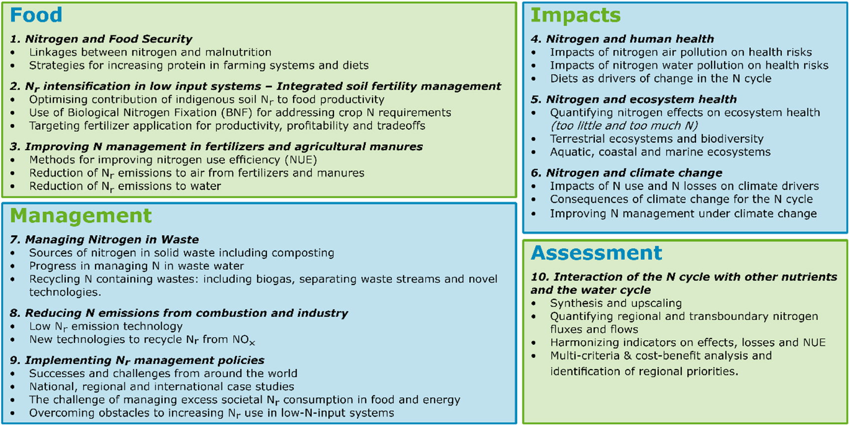 Figure 1. Illustration of four key topic areas detailing the interactions between reactive nitrogen and the environment, and options for the assessment and management, as framed in preparation for the N2013 conference.