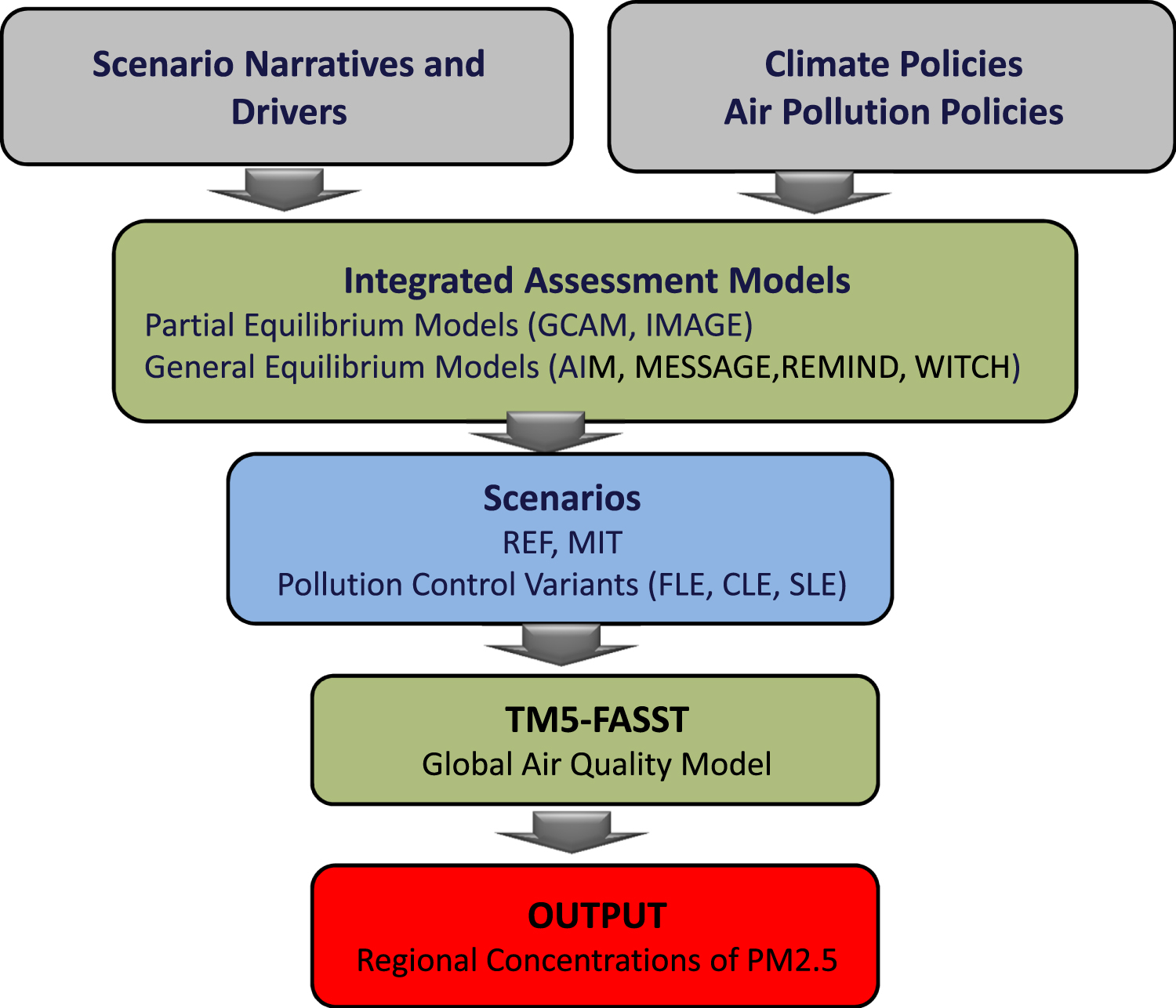 Integrated assessment models (IAMs) project economic growth, population, energy consumption, land-use and agriculture along with associated GHG and pollutant emissions. Scenarios developed using IAMs reflect plausible future pollutant emissions based on socioeconomic, environmental, and technological trends. The Representative Concentration Pathways (RCPs) [2], were the first set of long-term global air pollution scenarios developed across multiple IAMs. These scenarios were primarily developed for use by climate modelers and are based on a set of long-term radiative forcing targets. They reflect assumptions on the successful implementation of emissions controls in the next few decades and as a result show significant declines in particulate matter (PM) and ozone precursor emissions over the 21st century [3, 4]. Recent studies have pointed to the importance of a systematic assessment of future air quality across a wide range of uncertainties related to the enforcement of pollution control and alternative policies and developments in the underlying energy systems [5, 6].