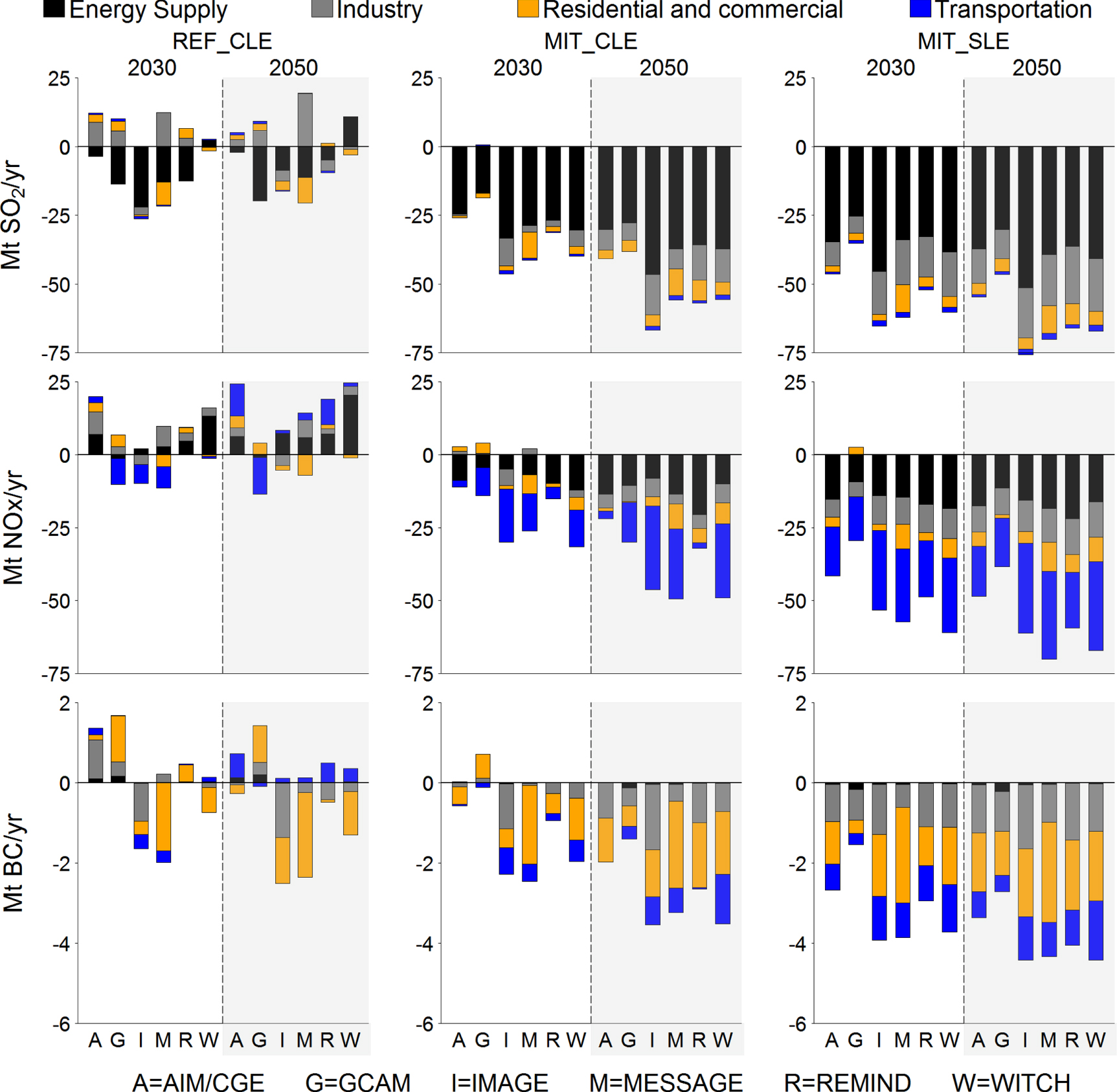 A closer look at the distribution of reductions in air pollutants across sectors is indicated in figure 3. It is important to note that that though we use consistent definitions of sectors in this study, the aggregate nature of the IAMs means that the results also depend on the assumed level of technological detail in a particular model. While we focus here on the energy supply and demand sectors, SI figure 7.4 indicates clearly that assumptions on land-use and other sectors could imply additional differences across the range of model realizations of the respective scenarios.