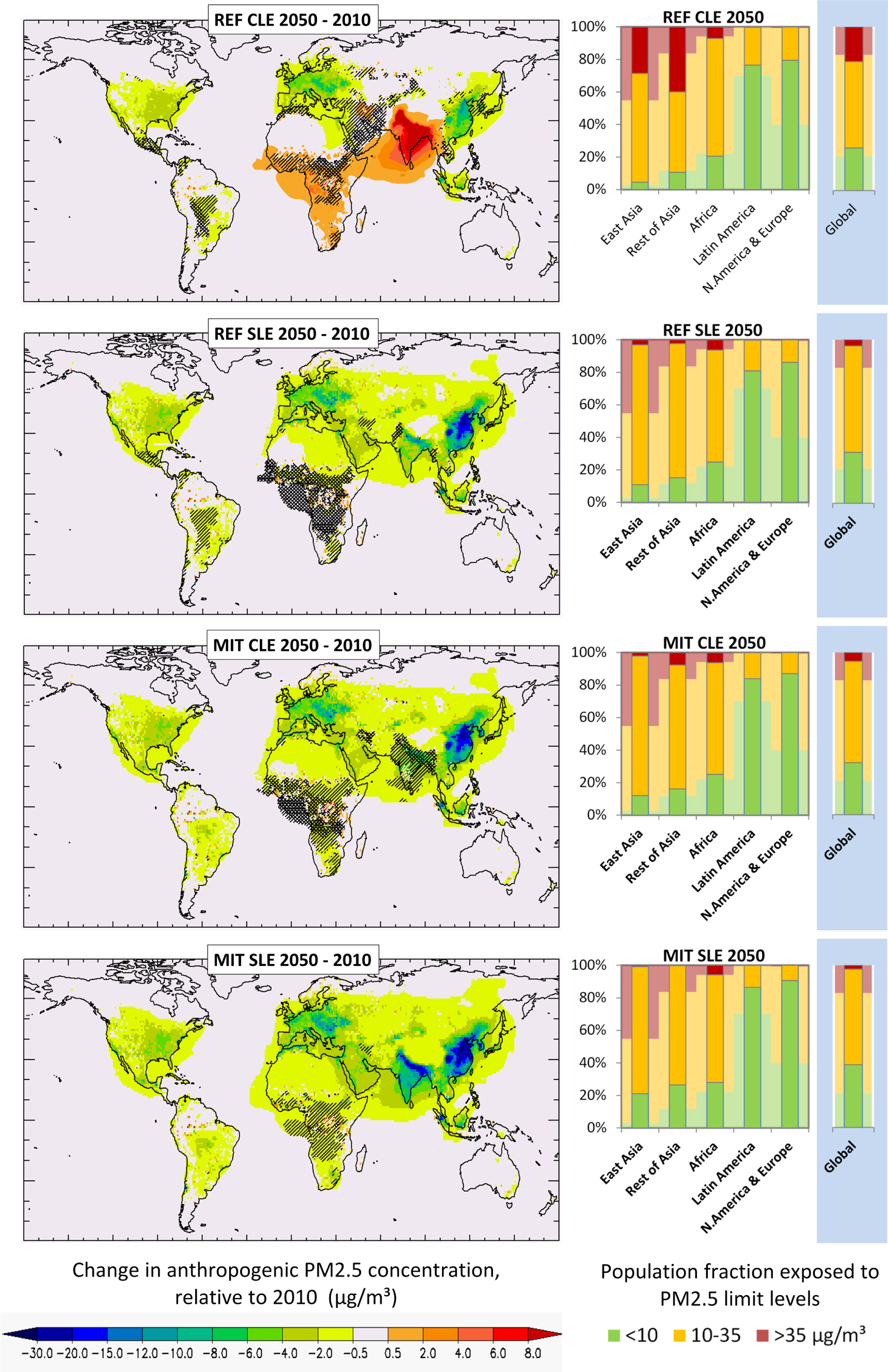 Figure 4. Left column; average difference in annual PM2.5 concentrations (includes primary PM components [BC, OC] and PM precursors [SO2, NOX, NMVOCs, CO, NH3) from all sources) between selected scenarios across the six models in 2050 and year 2010. Hatched areas indicate grid cells where at least one model has a different sign than the other models and where the standard deviation for the six models is larger than 0.5 μg m−3. Right column: regional and global fraction of population exposed to anthropogenic PM2.5 levels below 10, between 10 and 35 and above 35 μg m−3 for the scenario couples compared in the maps. Foreground: 2050 scenario; background: year 2010.