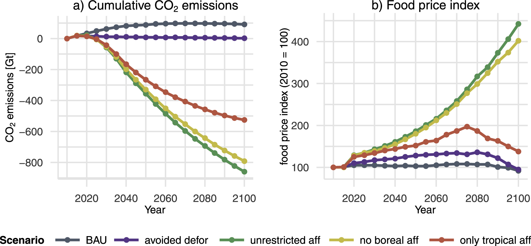Our study confirms that afforestation offers a high potential for carbon dioxide removal, and more than 860 Gt of CO2 are sequestered in our unrestricted afforestation scenario up to the end of the century. However, we also find that this afforestation leads to a more than fourfold increase in food prices by 2100. When afforestation is restricted to the tropics—and thus the albedo warming effect avoided—still substantial carbon sequestration can be achieved. This, at the same time, lowers global food prices substantially which nevertheless remain increased in tropical regions compared to a world without large-scale forest expansion. Our study suggests that a liberalisation of agricultural trade could further dampen the remaining price increases in tropical regions.