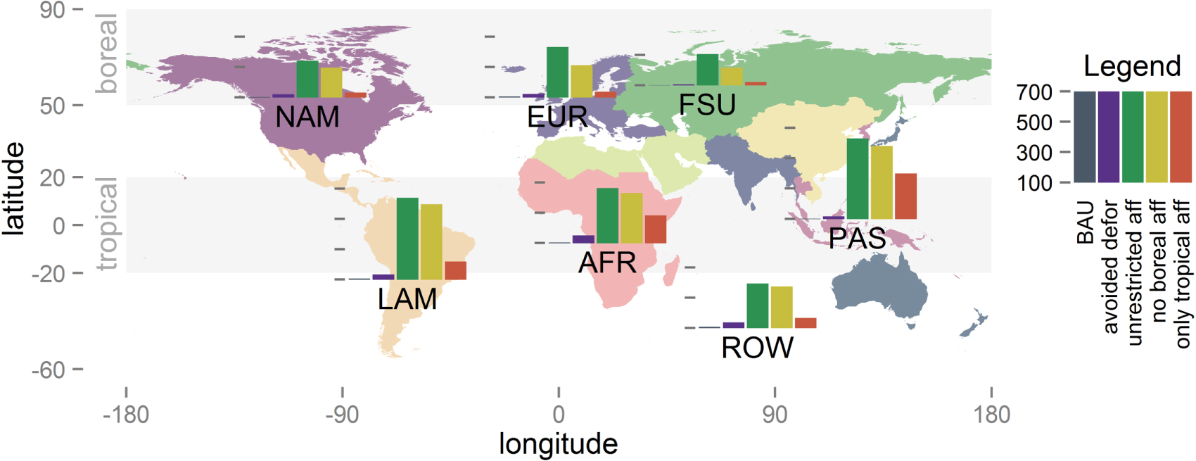 Standard image High-resolution imageThe restriction to no boreal afforestation reduces the afforested area by about 13% globally, but hardly changes the amount of land conversion in tropical regions. In the only tropical afforestation scenario, in contrast, the area of forest establishment is cut by half (table 1). While it remains at comparable levels in the tropical regions Africa and Pacific Asia it is lower in Latin America (435 Mha), because areas in the south (>20°S) were not considered for afforestation (figure S9).