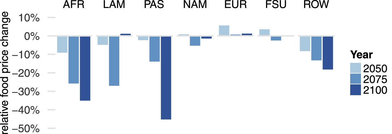 Figure 3. Regional food price indices at maximum over the course of the century (2010 = 100) for 6 out 10 modelled regions AFR: Sub-Saharan Africa, LAM: Latin America, PAS: Pacific Asia, NAM: North America, EUR: Europe, FSU: Former Soviet Union, ROW: Rest of the World (four remaining model regions aggregated).