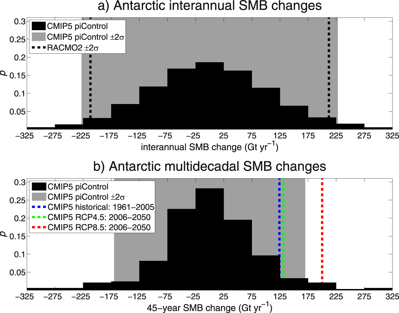 Figure 4. Probability distributions of Antarctic surface mass balance (SMB) changes on interannual (panel a) and multidecadal (45 year; panel b) timescales derived from the CMIP5 models' pre-industrial control (piControl) simulations. Gray shading denotes the ±2-sigma range of the distributions. In panel (a), dashed black lines bracket the ±2-sigma range of interannual SMB variability simulated by the reanalysis-driven RACMO2 regional atmospheric model during 1979–2011 (as reported in van Wessem et al 2014). In panel (b), dashed colored lines represent the 45 year forced (i.e., CMIP5 multimodel mean) SMB change during 1961–2005 in the historical experiment (dashed blue line), and during 2006–2050 in the RCP4.5 and RCP8.5 experiments (dashed green and red lines, respectively).